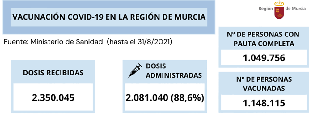 Con las vacunas administradas hasta el martes, el total de dosis administradas es de 2.081.040 (88,6%), siendo 1.049.756 personas las que han recibido la pauta completa.