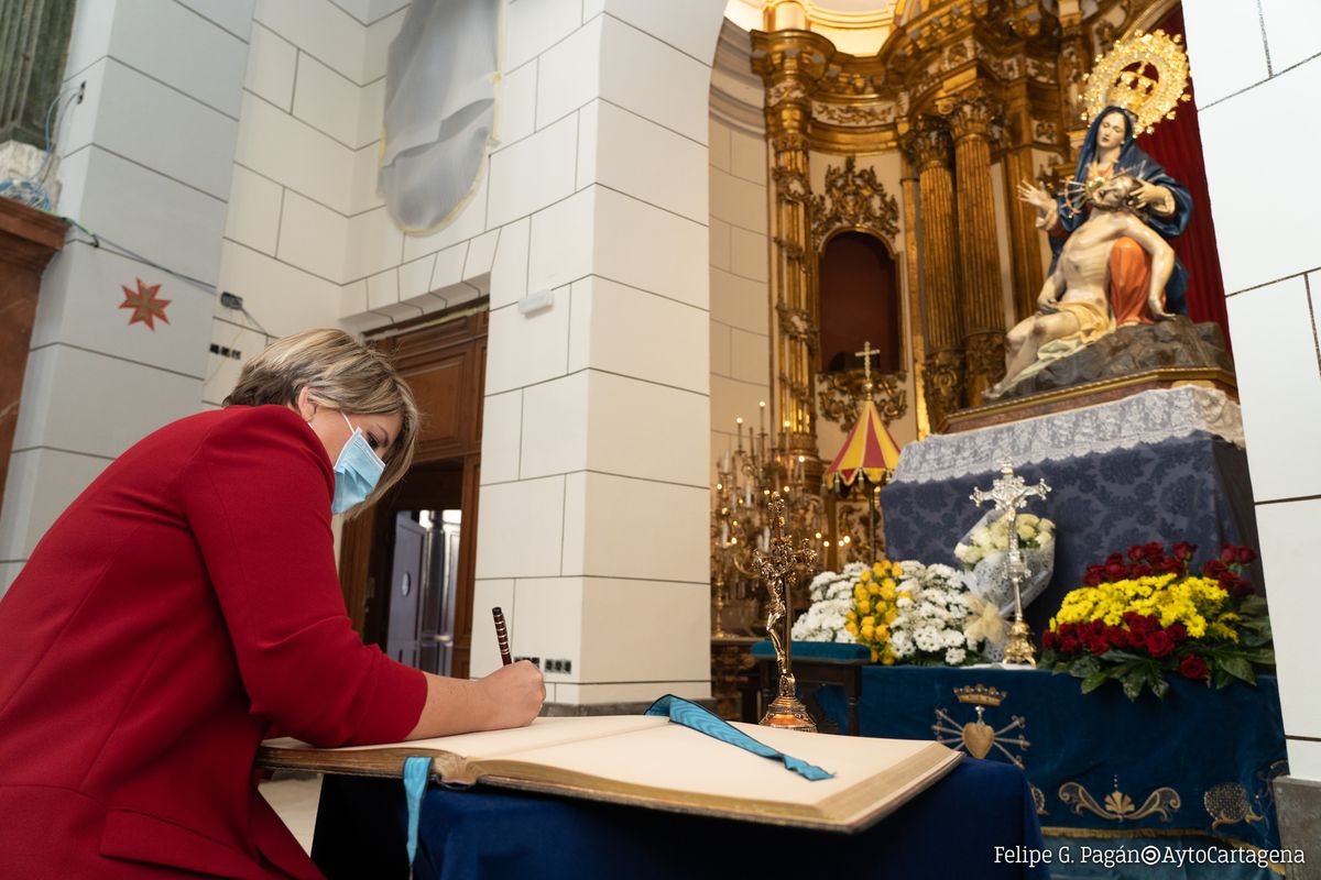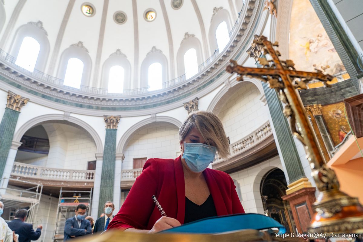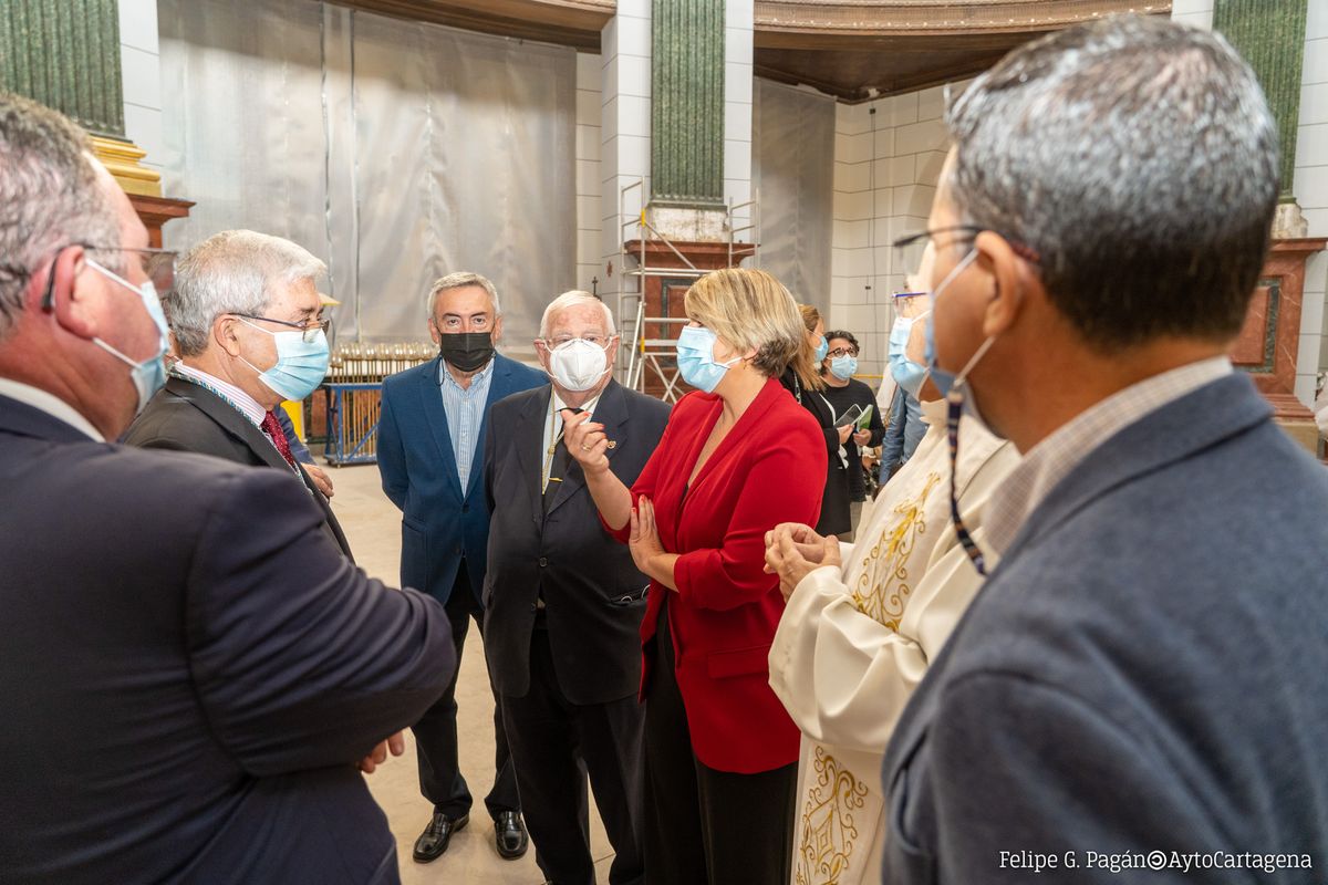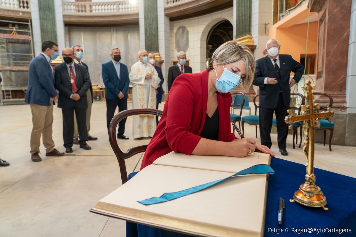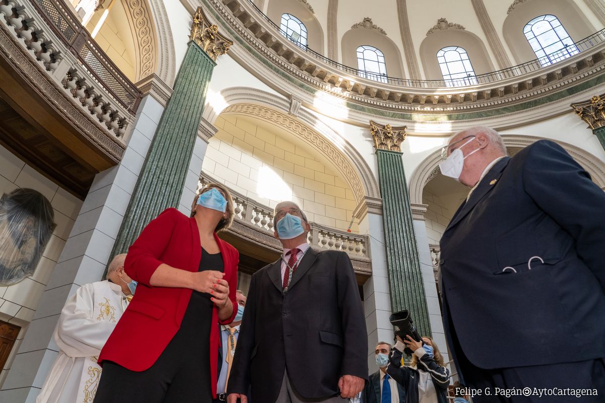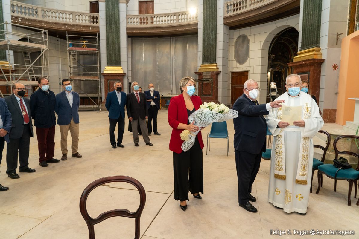 Noelia Arroyo, quien ha acudido a la Basílica Menor para conocer el estado de las obras de rehabilitación, firmar en el 'Libro de oro' y efectuar una ofrenda floral, ha anunciado que el próximo año se dedicará a la Virgen de la Caridad para celebrar sus tres siglos de presencia en Cartagena y el centenario de su coronación.