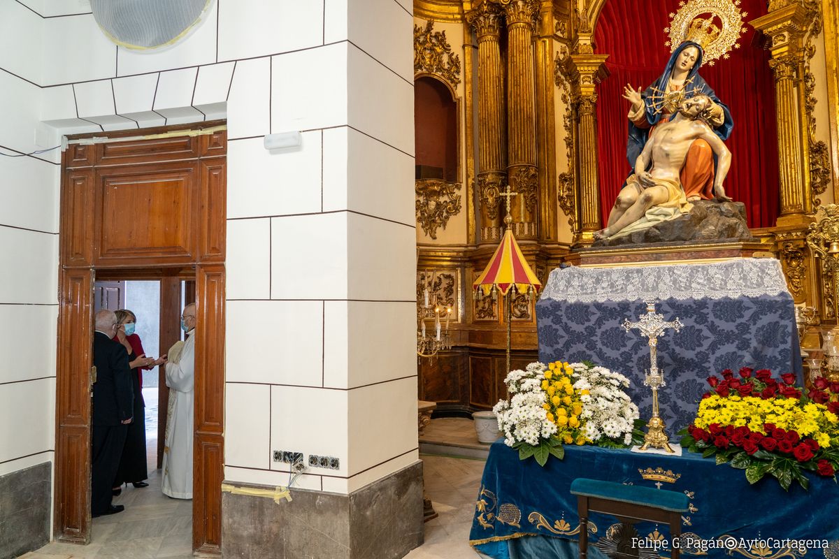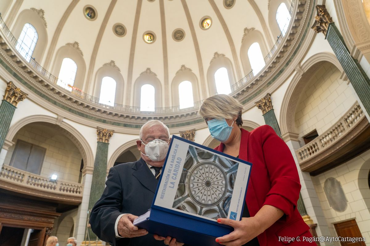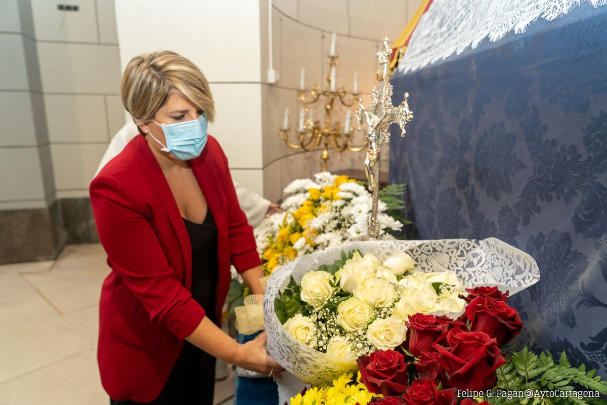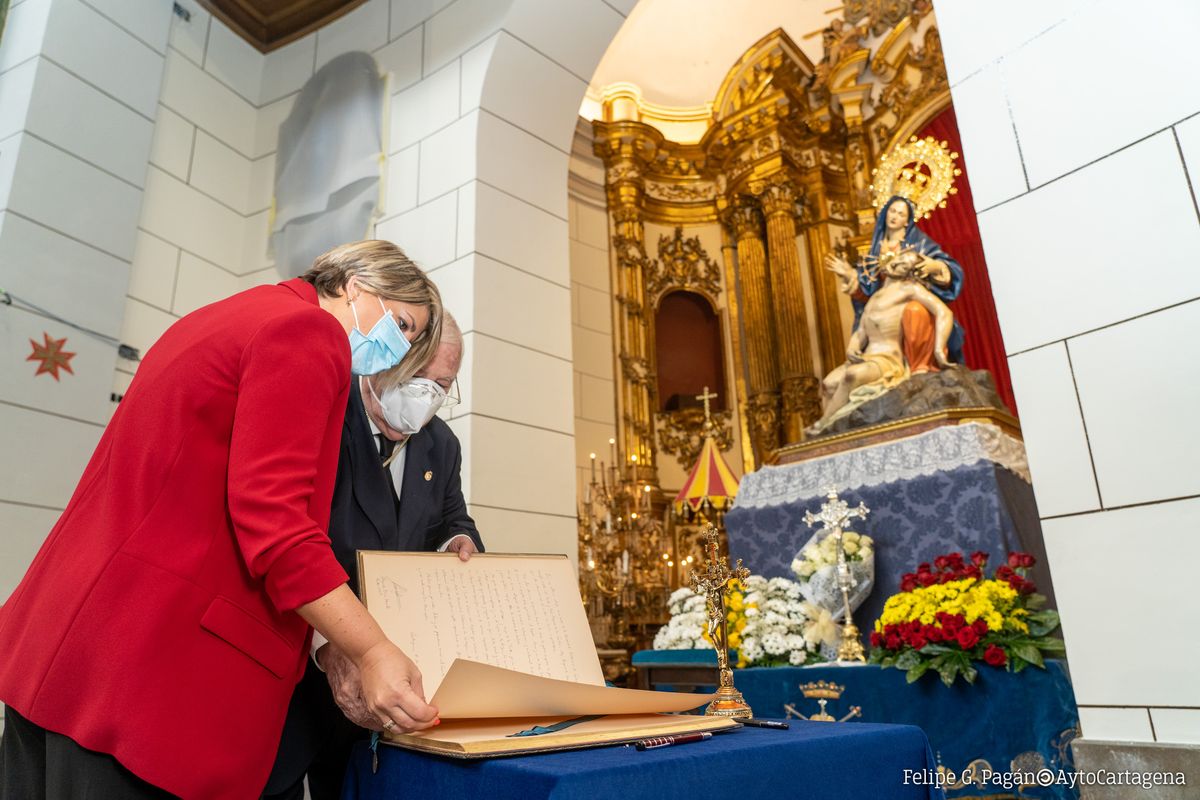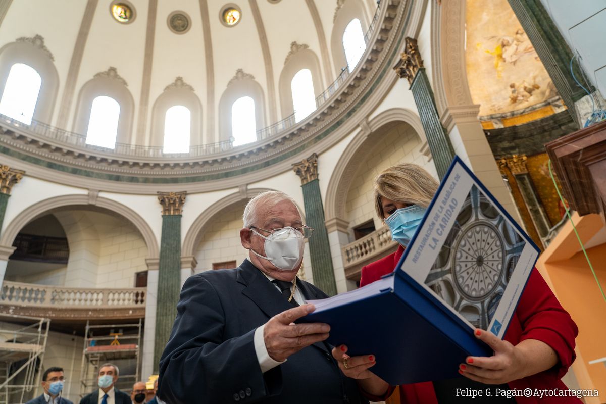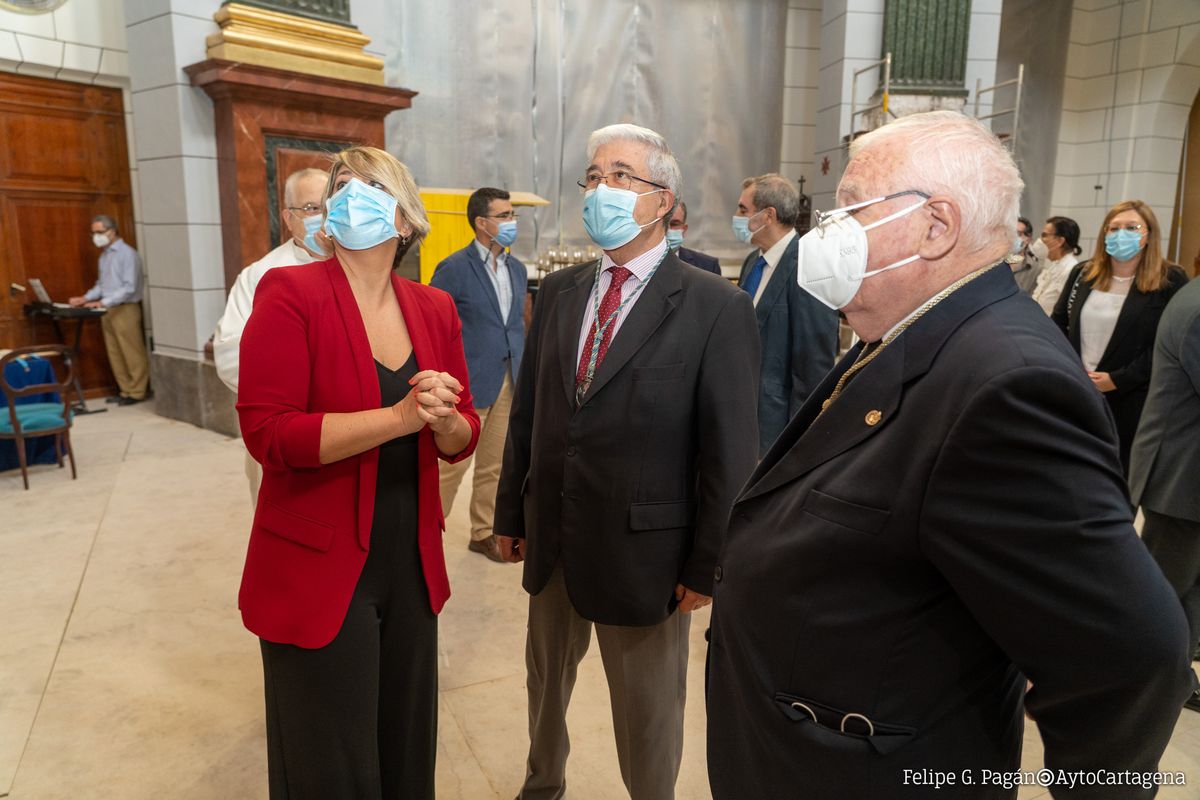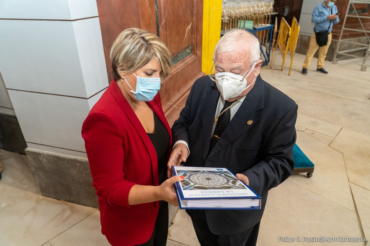 Noelia Arroyo, quien ha acudido a la Basílica Menor para conocer el estado de las obras de rehabilitación, firmar en el 'Libro de oro' y efectuar una ofrenda floral, ha anunciado que el próximo año se dedicará a la Virgen de la Caridad para celebrar sus tres siglos de presencia en Cartagena y el centenario de su coronación.