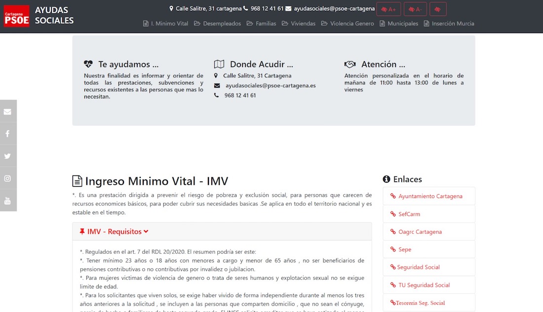 “Invitamos a todo el mundo a que acceda a la página web del PSOE de Cartagena y pinche en el menú ‘Ayudas Sociales’ o entre directamente en la dirección https://psoe-cartagena.es/ayudasociales.html para acceder a esta nueva herramienta, esperando que resulte útil y animando a difundir y compartir para que la información llegue al máximo número de personas posible”, ha finalizado.