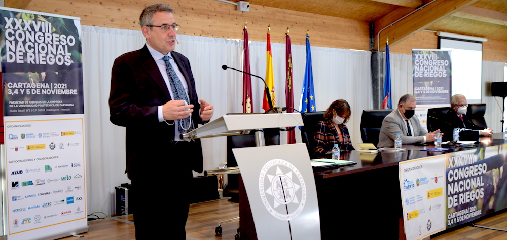 El subdirector de Planificación Hidrológica del Ministerio de Transición Ecológica, Víctor Arqued, explica hoy en el Congreso Nacional de Riegos que se celebra en Cartagena las distintas medidas que se contemplan en toda Europa para lograr la resiliencia del regadío. “El objetivo es mantener los niveles de productividad y beneficio del sector agrícola”, explica.