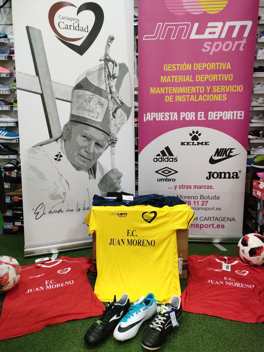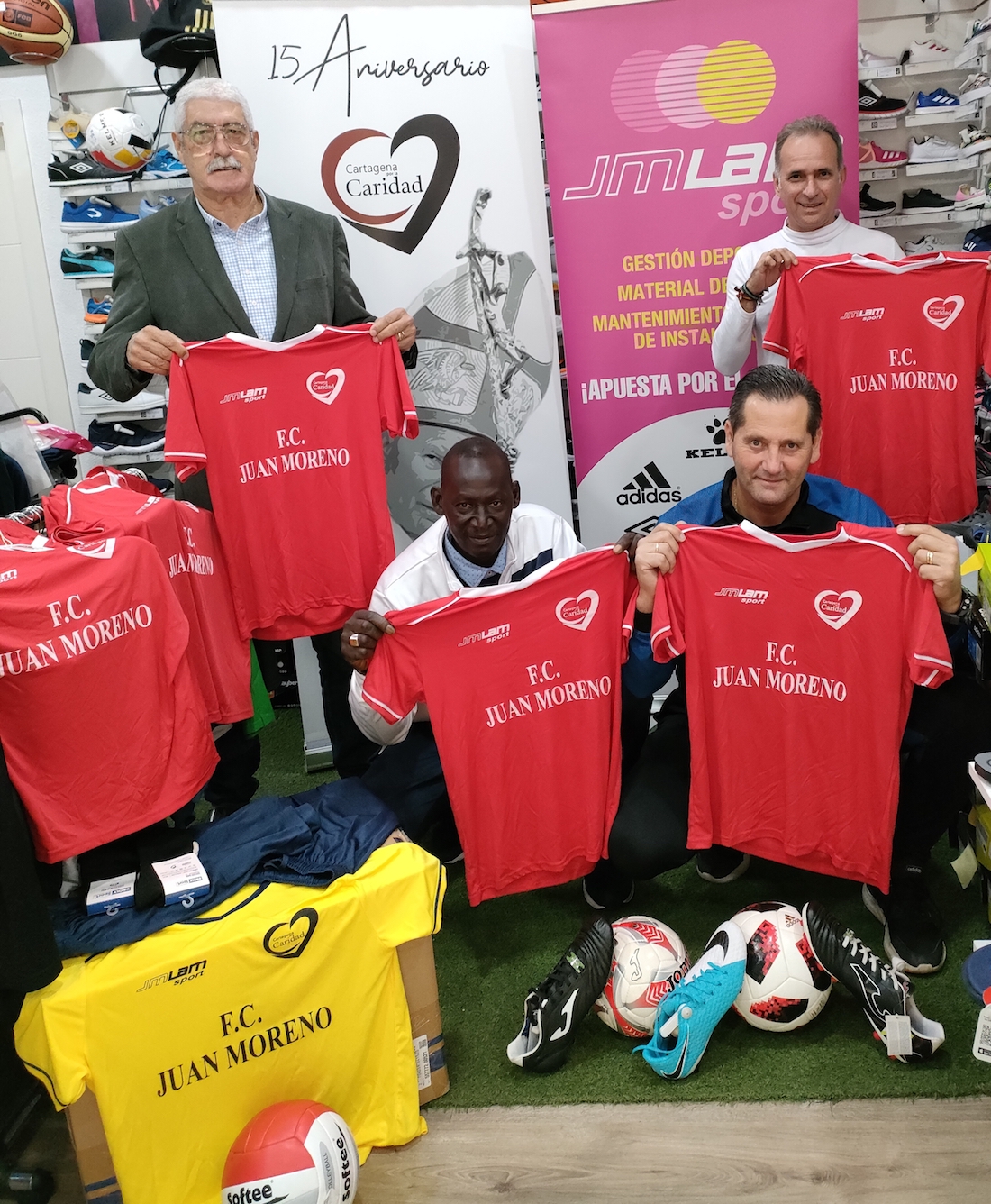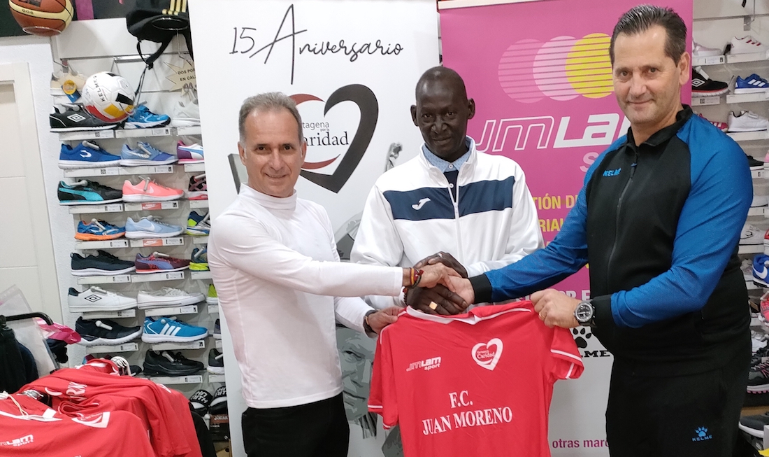 Esta mañana y bajo el patrocinio y apadrinamiento de la tienda de deportes JMLAN Sport cuyo gerente es el propio Juan Moreno, y la iniciativa apostólica Cartagena por la Caridad, se ha hecho entrega al representante senegalés Ndiake Ndiage, de un vestuario completo de camisetas, pantalones y calcetas, así como de diverso material deportivo, que lucirán pequeños de edades comprendidas entre los 10 y los 13 años, para disputar el campeonato de fútbol local.