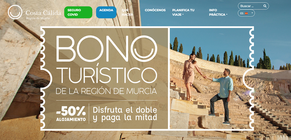 El gobierno autonómico lanza una ayuda directa para la adquisición de paquetes turísticos dentro de la propia Región de Murcia. Se trata del bono turístgico, que cubre el 50% del coste de los servicios subvencionables del viaje, con un máximo de 250 euros, IVA incluido.