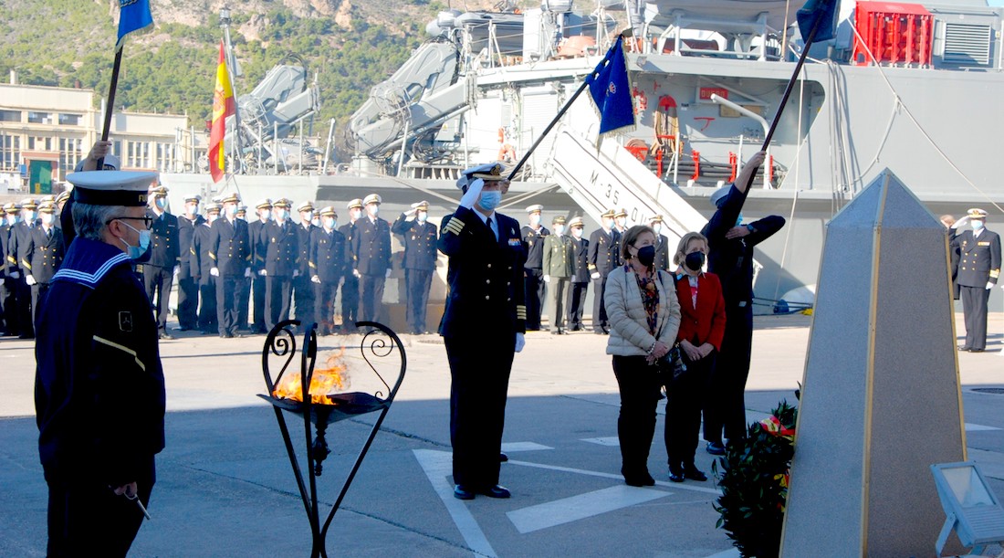 Tras una ofrenda con corona de laurel en el que han participado las hijas del suboficial radio Manuel Samper, uno de los miembros de la dotación del “Guadalete” en el naufragio, y las palabras del Comandante de la Fuerza MCM, capitán de navío Miguel Cuartero Lorenzo, el acto ha finalizado con el Himno de la Armada.
