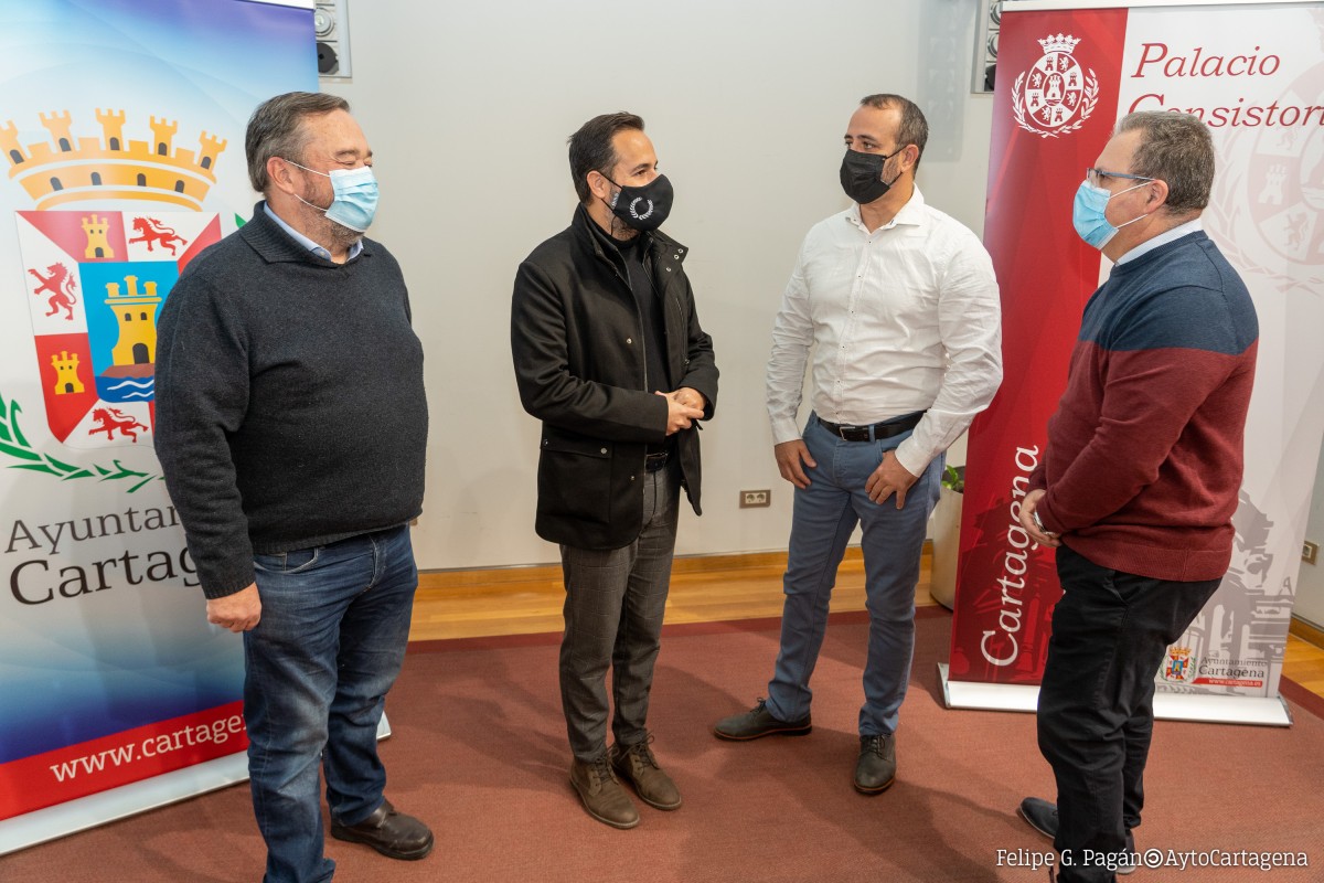 El concejal del área de Cultura, David Martínez Noguera, acompañado por el presidente de la AESCT, Carlos Dosel, el tesorero Juan Tebar y el secretario Fernando da Casa, dieron a conocer los fines de la asociación donde además de escritores nacidos o residentes en Cartagena, se pueden inscribir otros escritores de la Región de Murcia, con el requisito de haber publicado ya una obra.