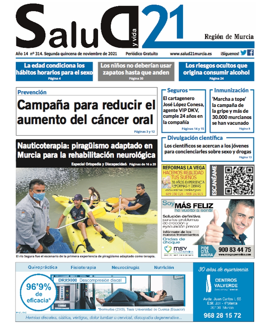 El nuevo número de la publicación en papel ofrece, entre otros temas: 'Campaña para reducir el aumento del cáncer oral', 'Nauticoterapia: piragüismo adaptado en Murcia para la rehabilitación neurológica', 'La edad condiciona los hábitos horarios para el sexo' y 'Los niños no deberían usar zapatos hasta que anden'.