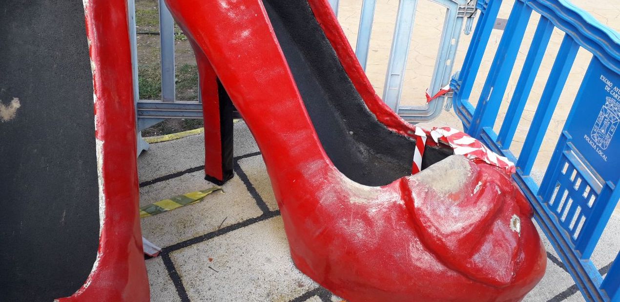 El portavoz adjunto de Movimiento Ciudadano, Jesús Giménez, portavoz adjunto de Movimiento Ciudadano, critica la paralización del contrato del macro contrato de mantenimiento de parques y jardines, resaltando que hay " columpios mal instalados en el parque Sauces, en el Parque Torres o El Molinete, entre otros lugares” y que el abandono es mayor en el litoral. La foto corresponde al zapato gigante de Dorothy del parque del Polígono Santa Ana inspirado en el cuento de ‘El mago de Oz’.
