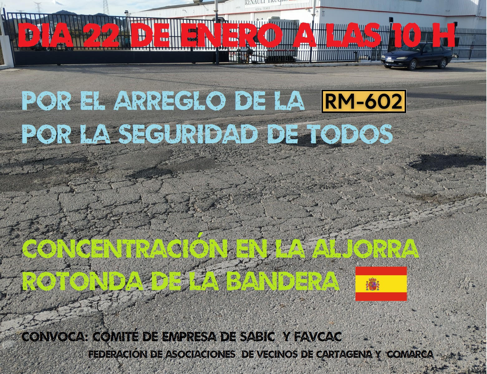 Esta mañana, el Grupo municipal MC Cartagena, representado por José López, Jesús Giménez, María José Soler y Enrique Pérez, ha acompañado a los trabajadores y comité de empresa de Sabic en la protesta realizada ante la puerta de la Asamblea Regional ante el deplorable y peligroso estado en que se encuentra la carretera RM-602, que da acceso a dicha empresa.
