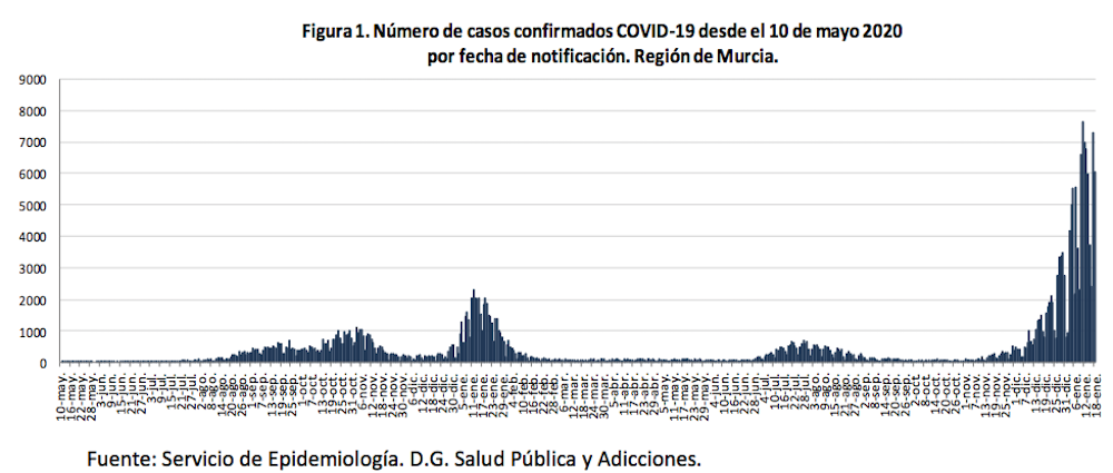 De los 6.053 nuevos casos registrados ayer, 1.890 corresponden al municipio de Murcia, 801 a Cartagena, 404 a Lorca, 244 a Molina de Segura, 201 a Yecla, 169 a Torre Pacheco, 154 a Alcantarilla, 149 a Águilas, 133 a San Javier, 127 a Cieza, 118 a Caravaca de la Cruz, 104 a Totana, 102 a Alhama de Murcia, 97 a Santomera, 87 a La Unión, 84 a San pedro del Pinatar, 82 a Mazarrón y 80 a Jumilla y Las Torres de Cotillas. El resto están repartidos por los demás municipios.