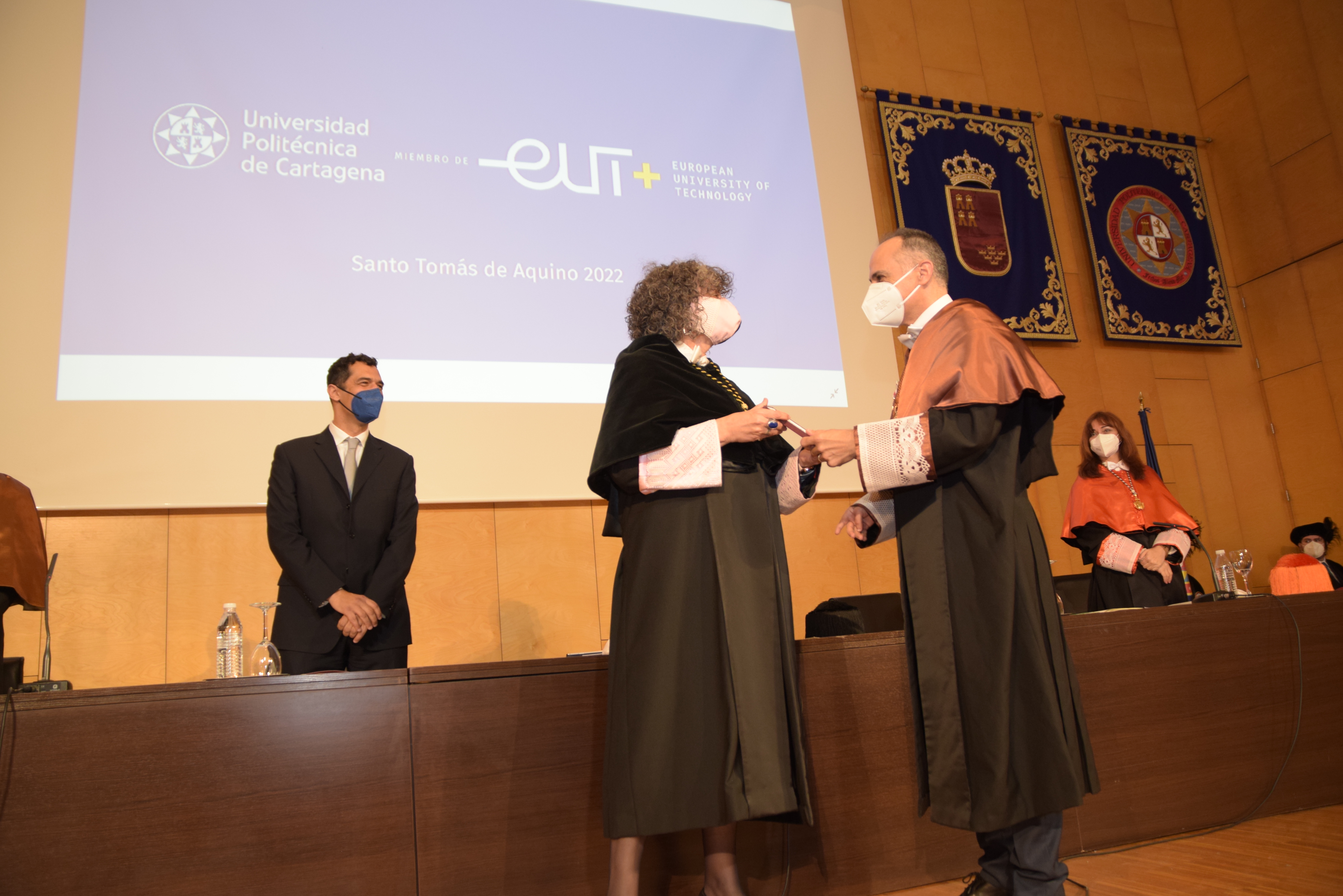 “Especialmente emotivo”, así ha definido Beatriz Miguel el solemne acto de Santo Tomás de Aquino, que se ha vuelto a celebrar hoy en el Paraninfo, recuperando en parte el formato tradicional que tuvo que alterarse el pasado año, cuando aún apenas había población vacunada contra una pandemia a cuyas situaciones adversas sobrevenidas “la Universidad Politécnica de Cartagena ha sabido adaptarse”, según ha remarcado la rectora, concluyendo: “La Covid no nos ha parado”.