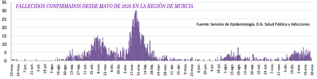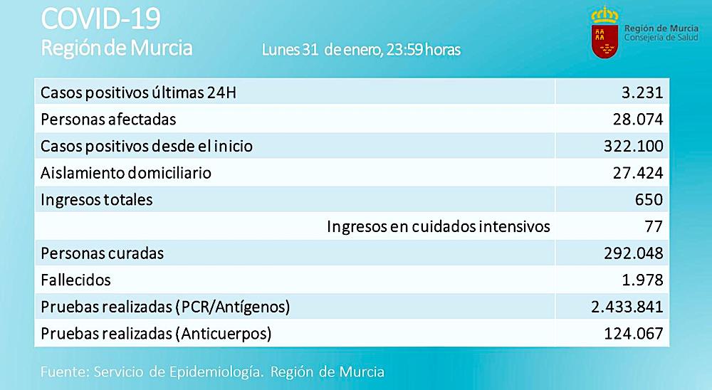 Fueron, en total, siete enfermos de coronavirus, de entre 60 y 96 años de edad, los que perdieron ayer la vida en la Región de Murcia. Los contagios diarios siguen bajando (3.231 se detectaron ayer, de los que 452 corresponden a nuestro municipio), pero se mantiene la ocupación hospitalaria (hoy ya más personas ingresadas que una semana atrás) y la sucesión de fallecimientos.