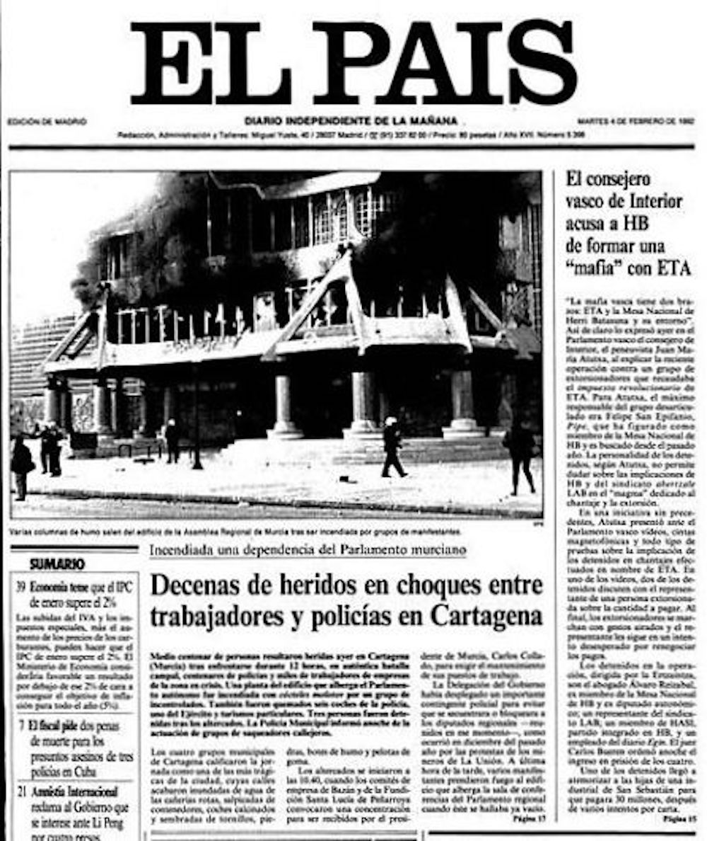 Fue el 3 de febrero de 1992 cuando el fuego asomó por las ventanas exteriores de la Asamblea Regional. Fue un cóctel molotov. ¿Intencionado? Hay división de opiniones. Fueron escenas que dieron la vuelta al mundo y que llegaban en una época de manifestaciones de los trabajadores por el cierre de Peñarroya y de Fertilizantes, por el expediente de regulación de Bazán y recortes en el sector naval, que generó incertidumbre laboral en muchas familias.