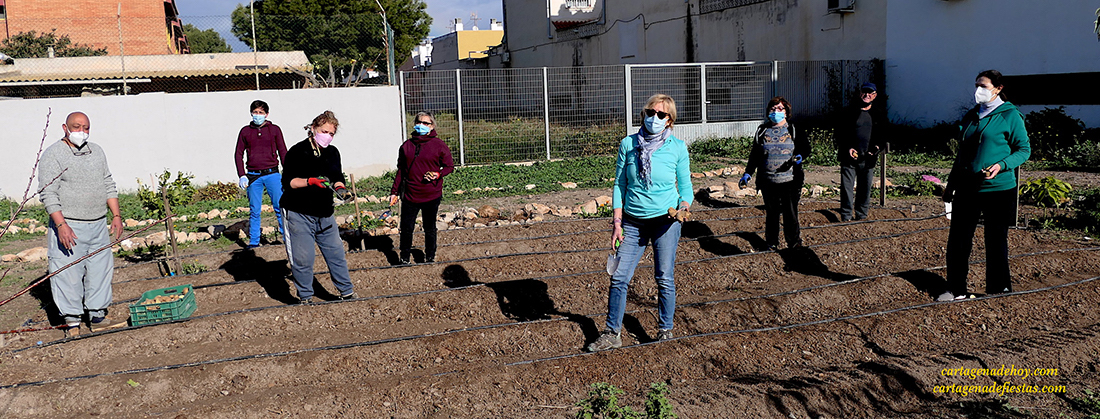 Ese día toca plantar cuatro clases de patatas. Eso sí, ecológicas, como todo lo que hay dentro de los límites de esta parcela que en su día fue solar y que ahora se ha convertido en zona verde junto a la villa de San Antón y la barriada de la Urbanización Mediterráneo. En marzo llegará el turno para pimientos, berenjenas y tomates, además de ajo de diente de elefante y espinacas. Las plantaciones no se repiten en las parcelas, siendo utilizadas de forma rotatoria para diferentes plantaciones, respetando sus etapas de barbecho cada tres años.
