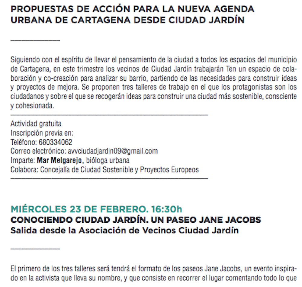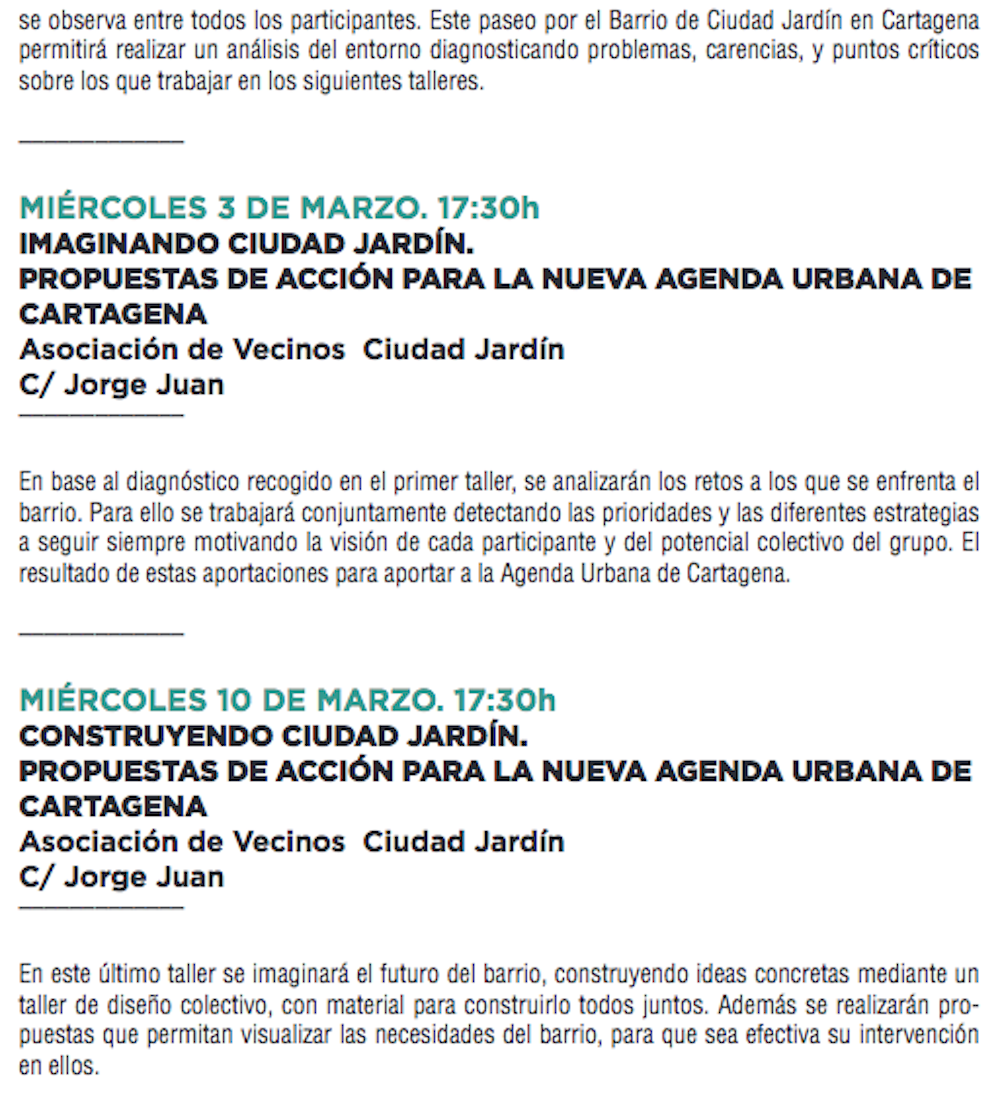 La iniciativa de la concejalía de Cultura llevará a cabo tres talleres gratuitos durante febrero y marzo en la barriada urbana cartagenera. El primero será el próximo día 23 con un paseo para analizar el entorno y diagnosticar sus problemas. En marzo, el local de la asociación de vecinos acogerá ‘Imaginando Ciudad Jardín’ con la base de las conclusiones de la anterior actividad y, el día 10, un cierre imaginando el futuro de esta barriada.