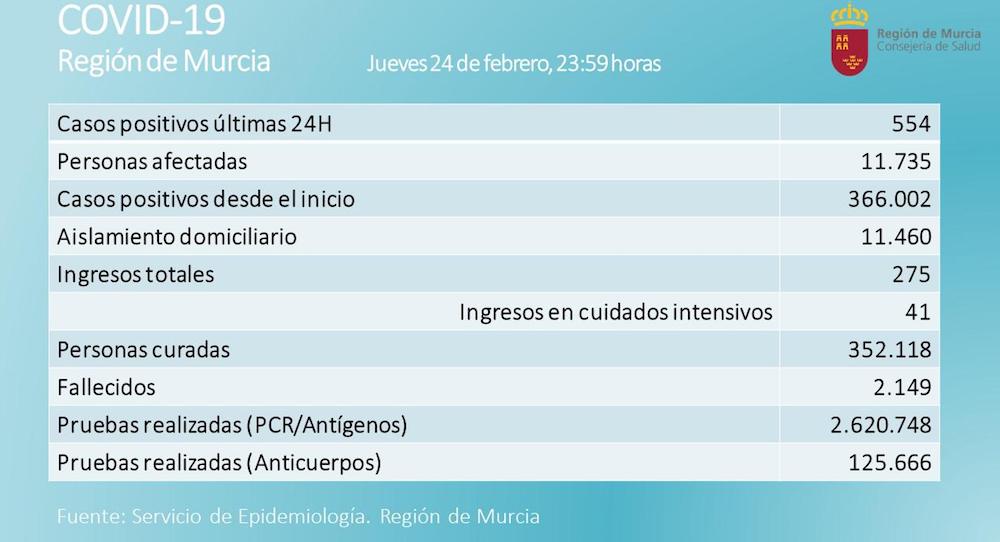 Actualización Coronavirus: De los 554 nuevos casos, 193 corresponden al municipio de Murcia, 81 a Cartagena, 34 a Molina de Segura, 17 a Águilas, 17 a Cieza, 14 a Alcantarilla, 14 a Lorca, 13 a San Pedro del Pinatar, 11 a San Javier y 10 a Archena, Yecla y Cehegín. El resto están repartidos por los demás municipios.