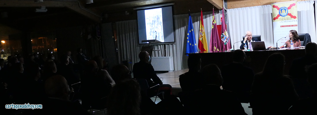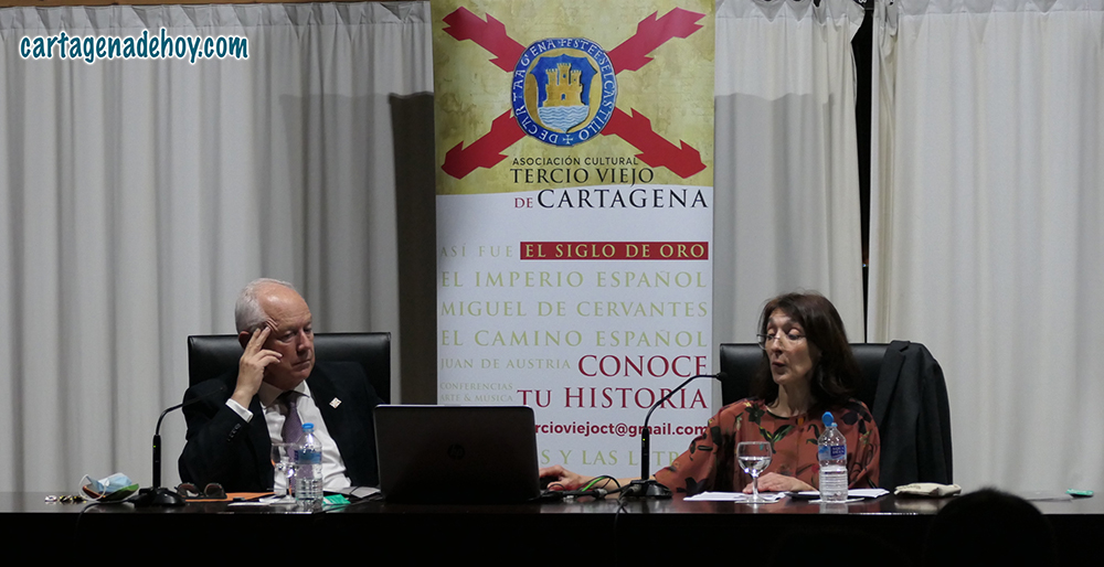 Ciento setenta y cinco personas completan el aforo autorizado en la sala Isaac Peral de la UPCT para el acto organizado por la asociación Tercio Viejo de Cartagena y la Escuela de Infantería de Marina ‘General Albacete Fuster’ sobre el cuadro que pintó Diego Velázquez, en el que Juan Orti (presidente del colectivo cartagenero) y Lucía Martínez (restauradora del Museo del Prado) expusieron numerosos entresijos de “un cuadro muy complejo”, como se afirmó, y de su motivación histórica.