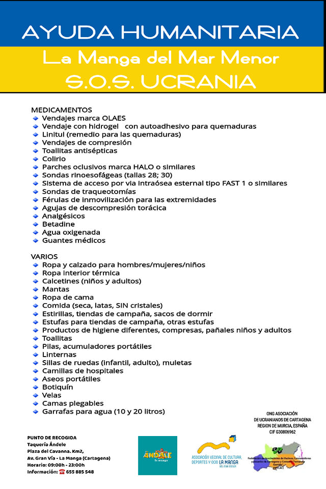 La Manga ha organizado también un operativo de ayuda a Ucrania. Han pedido medicamentos y artículos varios para enviar al país. Los artículos se recogerán en Taquería Ándele de 9 a 23 horas.
