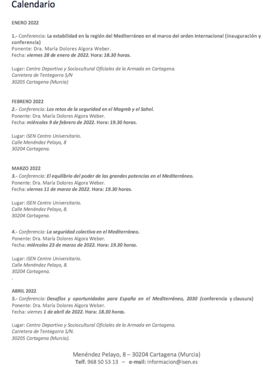 La programación responde a un ciclo de conferencias a cargo de la profesora Dra. María Dolores Algora Weber, investigadora del Centro de Seguridad Internacional de la Universidad Francisco de Vitoria. (www.mariadoloresalgora.es).