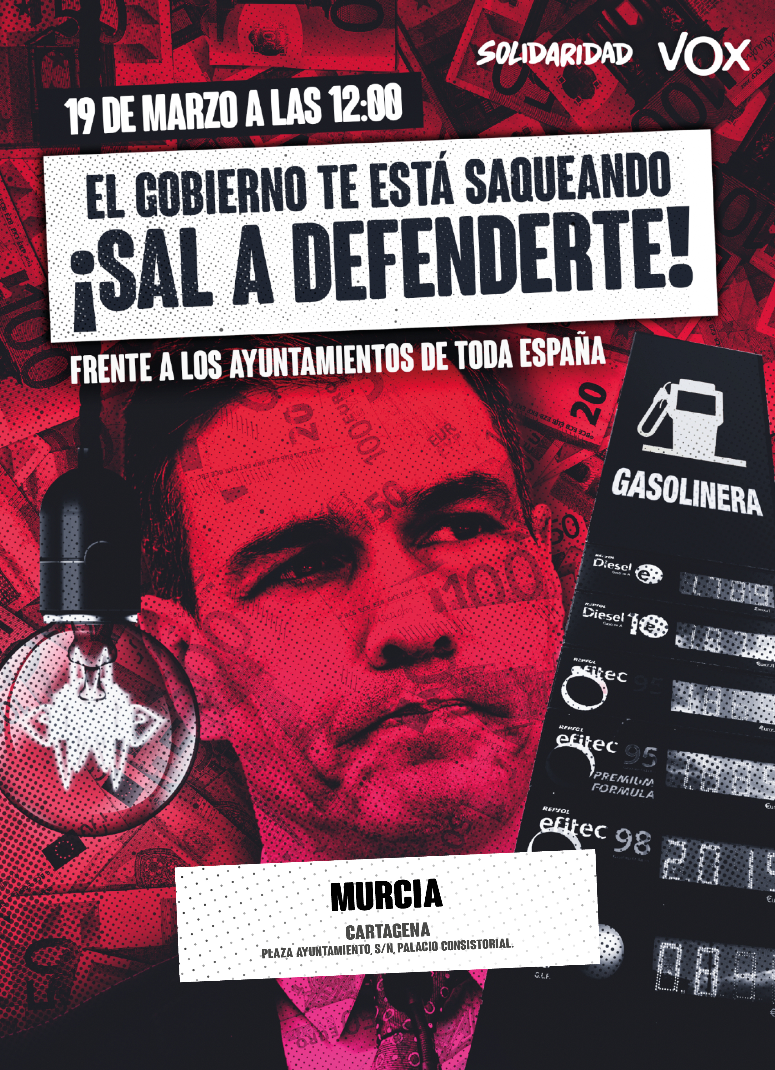 Convocan una concentración ante el Palacio Consistorial el próximo 19 de marzo contra la subida de la luz a las 12 de la mañana. La concentración la han convocado Solidaridad y VOX en protesta por los incrementos de precios que están soportando los ciudadanos en servicios básicos como la luz.