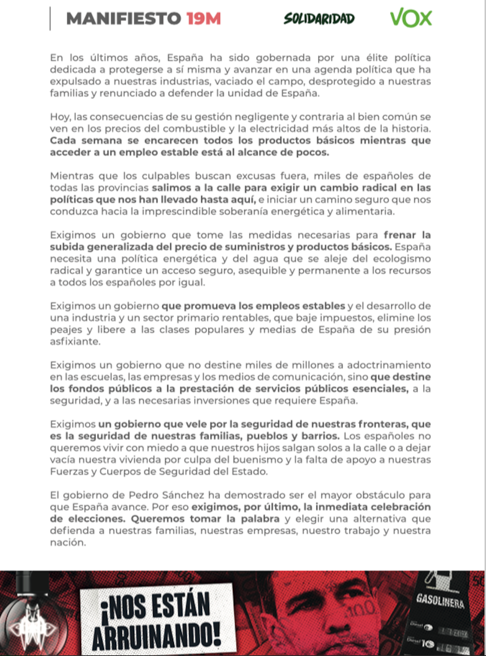 Un grupo de personas ha participado esta mañana en la manifestación convocada por Solidaridad y por VOX ante el Palacio Consistorial de Cartagena contra el gobierno de Pedro Sánchez por las desorbitadas subidas de los precios de la luz, de la gasolina y de otros suministros básicos, bajo el lema “hay que echarles” y en la que se ha dado lectura del manifiesto que a la vez se ha leído en numerosas ciudades de España.