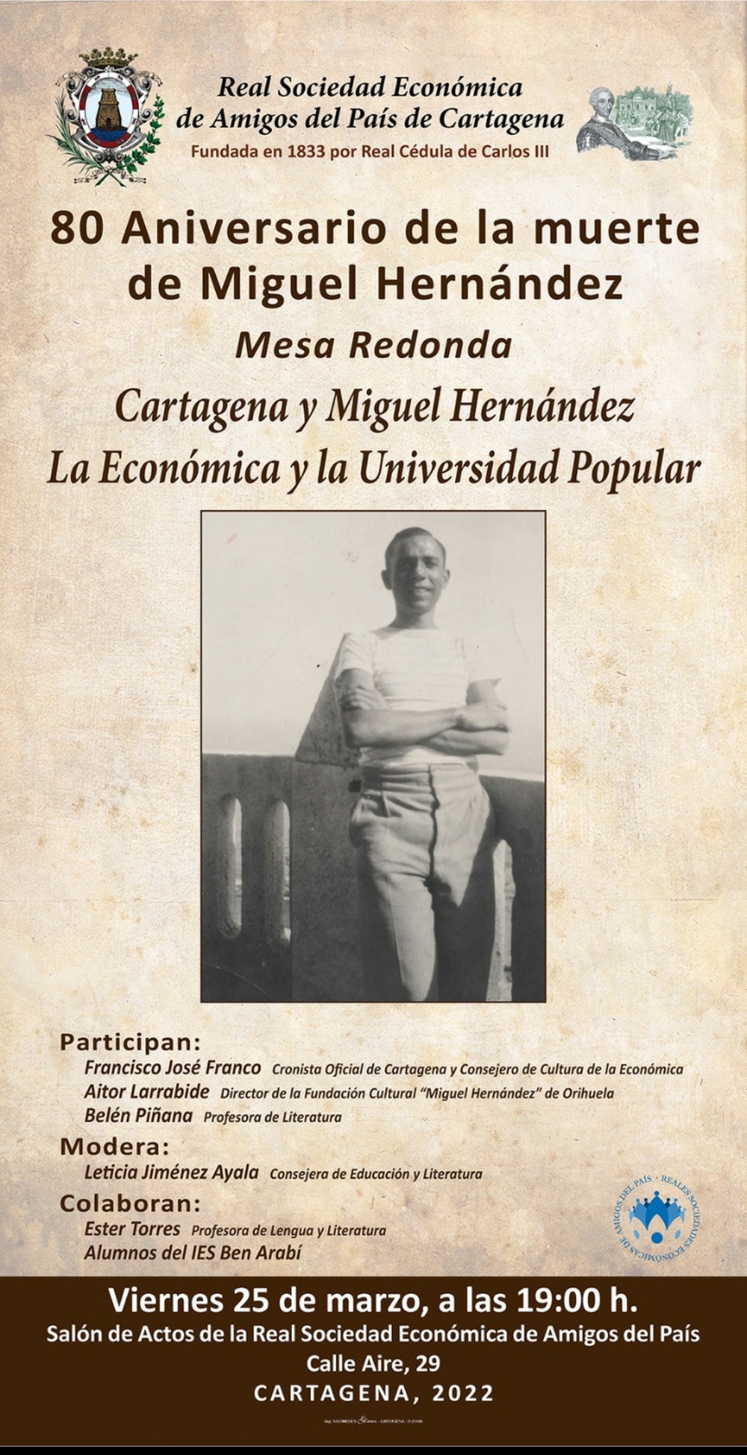 La Real Sociedad Económica de Amigos del País ha organizado una mesa redonda para el próximo 25 de marzo, a las 19 horas, por el 80 aniversario de la muerte de Miguel Hernández. En ella participarán el croista de Cartagena, Francisco Franco, el director de la Fundación Cultural Miguel Hernández, y la profesora de literatura, Belén Piñana.
