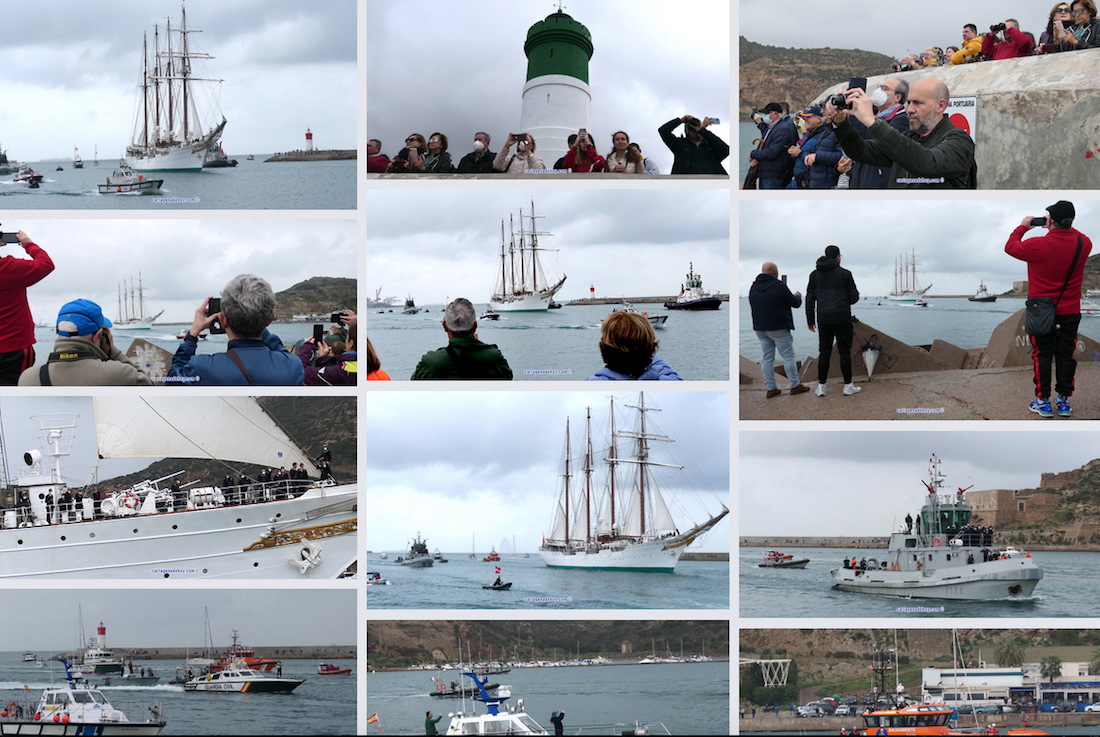 Cientos de personas, pese al clima adverso, han acudido a ver y a ‘acribillar a fotos’ la entrada del buque escuela por la bocana del puerto de Cartagena, localidad a la que ha regresado después de dos décadas para esta tarde darle nombre a la terminal de cruceros. GALERÍA DE FOTOS (pinchar aquí)
