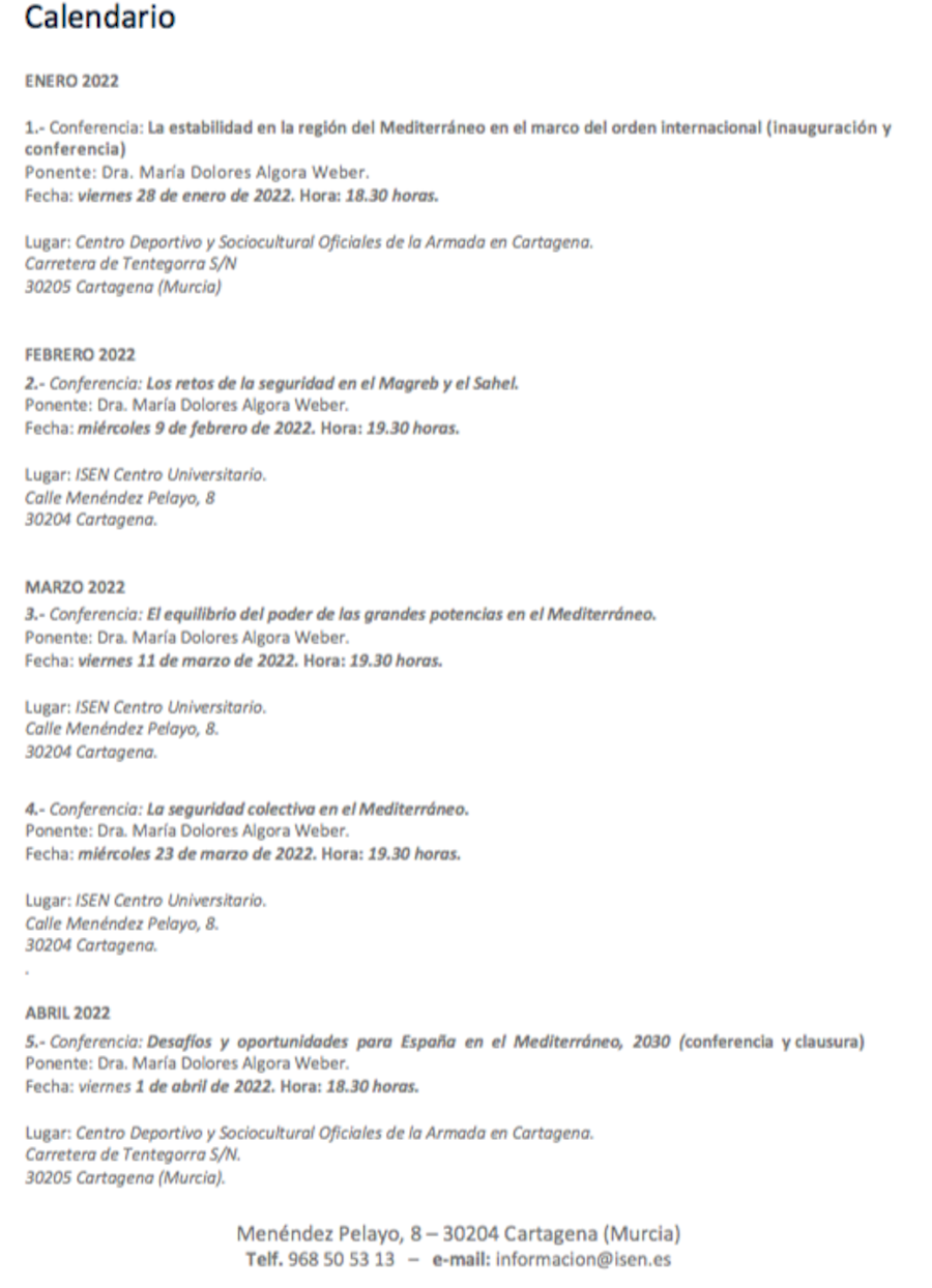 El marco institucional estará ligado a las actividades del Centro Deportivo y Sociocultural de Oficiales de la Armada CDSCA y a las de ISEN Centro Universitario, facultad adscrita a la Universidad de Murcia, ambos en Cartagena. La programación responde a un ciclo de conferencias a cargo de la profesora Dra. María Dolores Algora Weber, investigadora del Centro de Seguridad Internacional de la Universidad Francisco de Vitoria. (www.mariadoloresalgora.es).