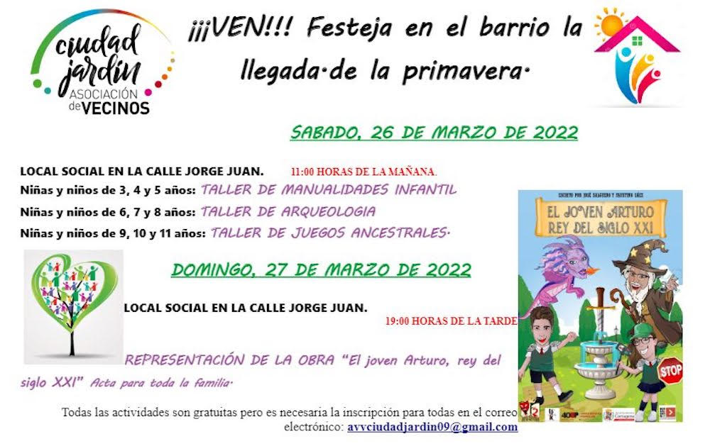 Leer más...Ciudad Jardín celebrará la llegada de la primavera este fin de semana. Lo hará con talleres de manualidades para los más pequeños y con la representación de la obra teatral 'El joven Arturo, rey del siglo XXI'.