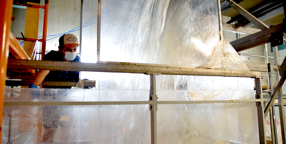 Investigadores de la Politécnica de Cartagena están estudiando la seguridad de las presas a través del análisis de la energía de los chorros turbulentos de sobrevertido en el Laboratorio de Ingeniería Hidráulica en el que se reproduce la situación de sobrevertido y su influencia en el cuenco de disipación. En esta infraestructura de investigación ha realizado sus ensayos el profesor de la Escuela Politécnica Nacional de Ecuador Patricio Rubén Ortega Lara, que es ya el segundo docente de esta universidad latinoamericana en doctorarse en la UPCT, tras la tesis que concluyó en 2019 Patricia Lorena Haro Ruiz.