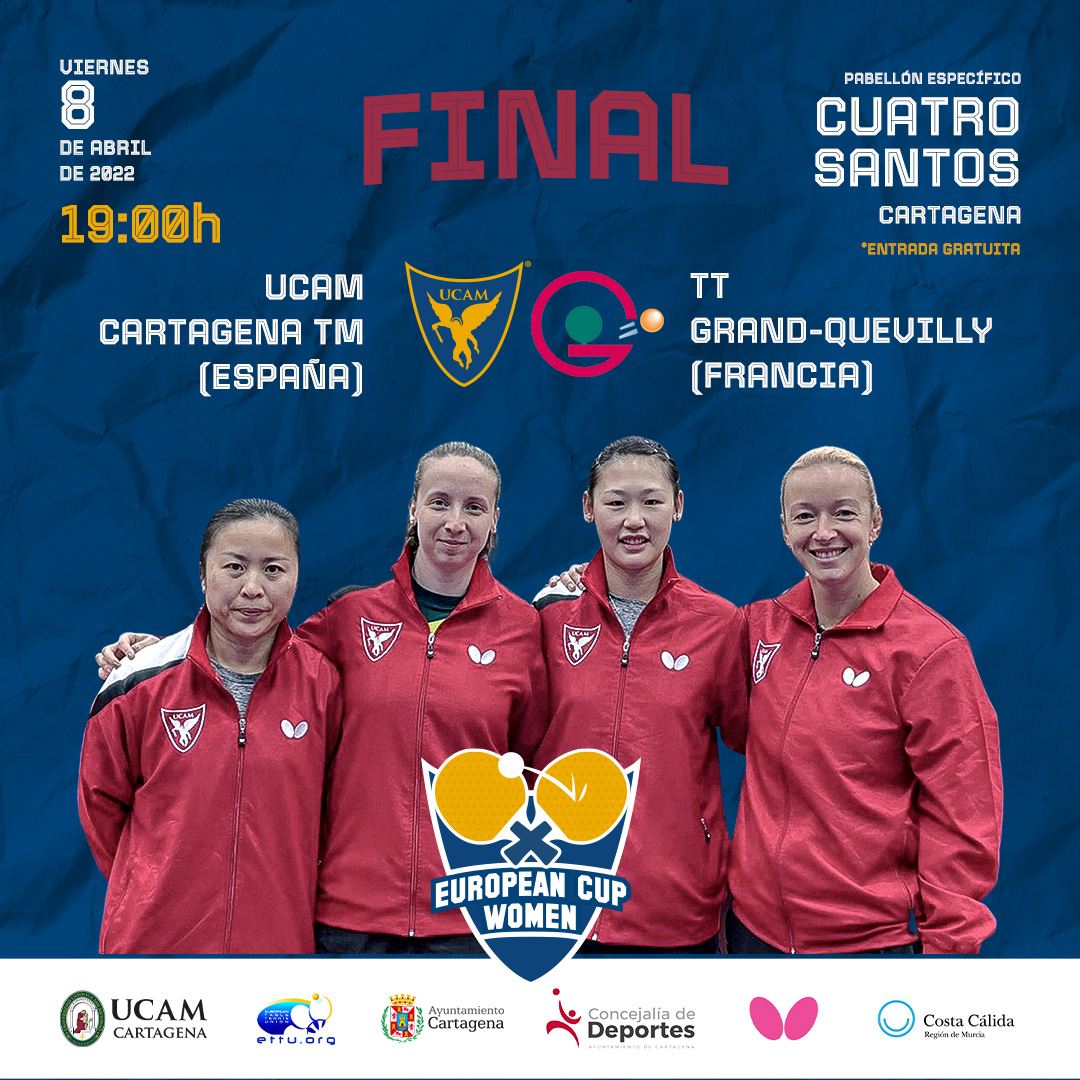 El equipo cartagenero de tenis de mesa competirá, este viernes, en el partido de vuelta de la Copa de Europa contra el equipo francés TT Grand- Ouevilly. Se trata de un encuentro importante ya que, si vencen a su rival, el equipo de la ciudad se alzaría con su cuarto título Europeo. La competición tendrá lugar en el Pabellón Cuatro Santos de tenis de mesa a las 19:00 horas.
