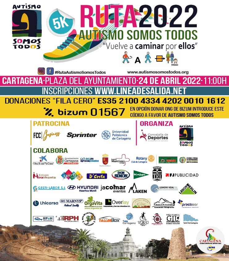 El próximo 24 de abril, la ciudad de Cartagena acogerá la ruta 'Autismo somos todos' que, tras celebrar su primera edición en 2019, volverá a recorrer las calles el último domingo del mes. Con un recorrido de 5 kilómetros, tendrá su punto de salida a las 11:00 horas desde la plaza del Ayuntamiento terminando en la misma donde se realizarán diferentes actividades para los participantes.