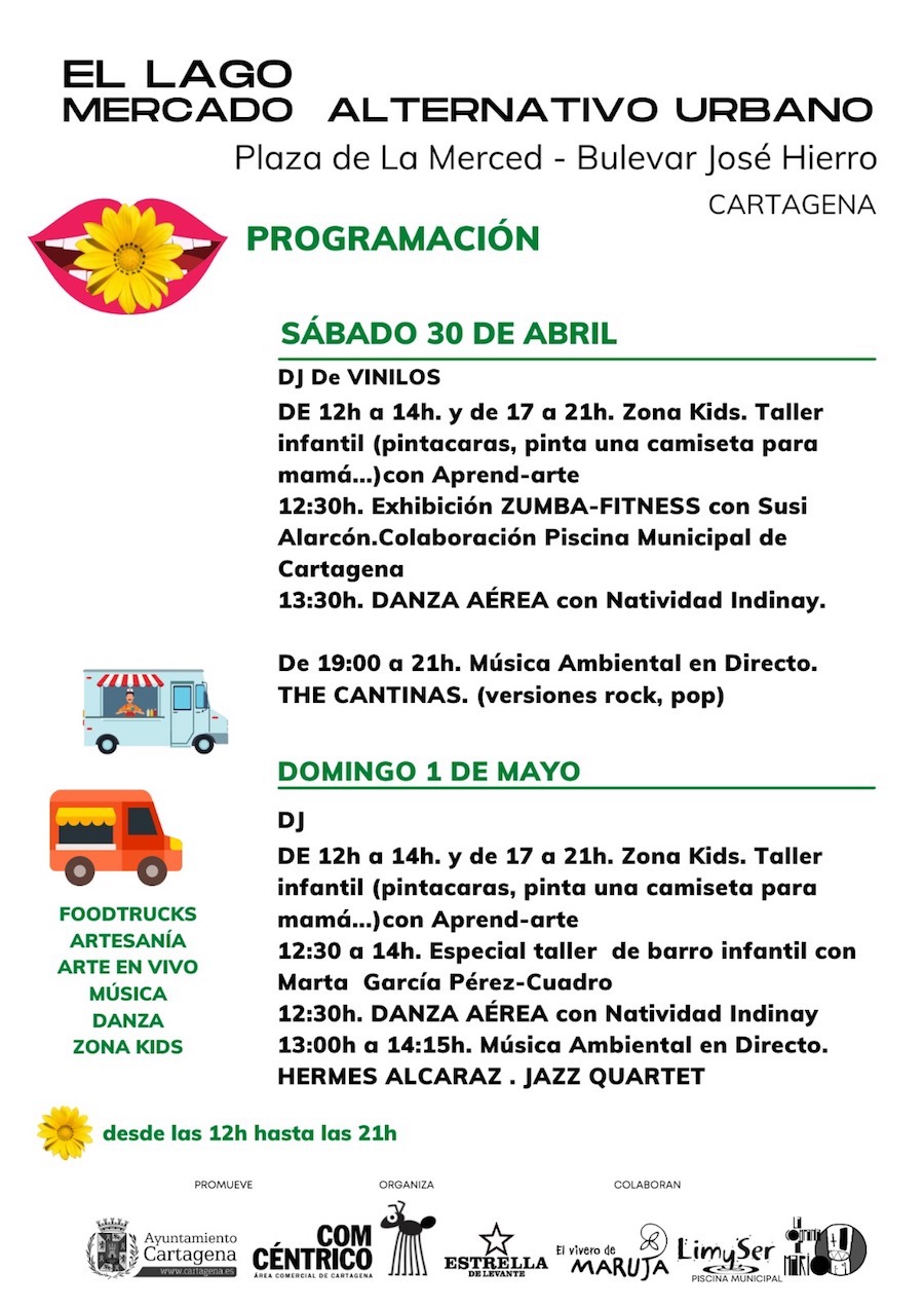 El primer 'Mercado urbano alternativo' de esta primavera en Cartagena se dedicará a la flor. Será durante los días 30 de abril y 1 de mayo, coincidiendo con el 'Día de la madre', cuando los interesados podrán acercarse a la zona del Bulevar José Hierro y la plaza de la Merced de 12 a 21 horas. Habrá productos de artesanía, discos de vinilo, arte en vivo, danza aérea, zumba, música en directo...