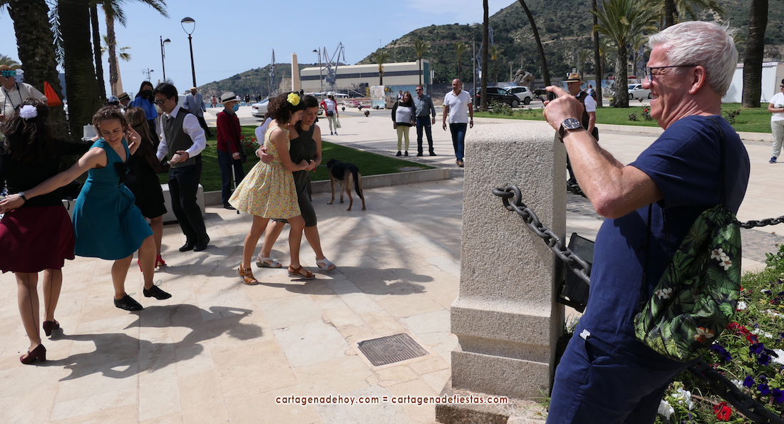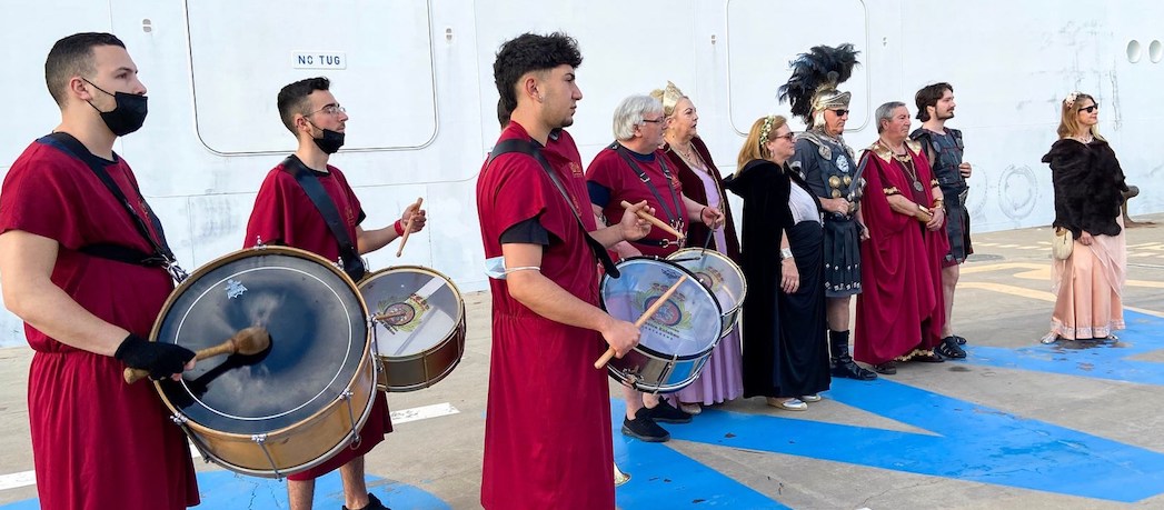 Al bajar a tierra han sido recibidos, como ya es tradición, por una representación de las Fiestas de Carthagineses y Romanos con festeros vestidos de época acompañados por el grupo de tambores. Luego, al adentrarse en el casco urbano, han comprobado que es una ciudad muy activa. Primero se han encontrado, en la plaza Héroes de Cavite, al colectivo modernista de Cartagena de Levante representando un picnic campestre con competiciones deportivas. Luego, cuando han llegado a las calles del centro, muchos se han cruzado con la manifestación del día del trabajo.