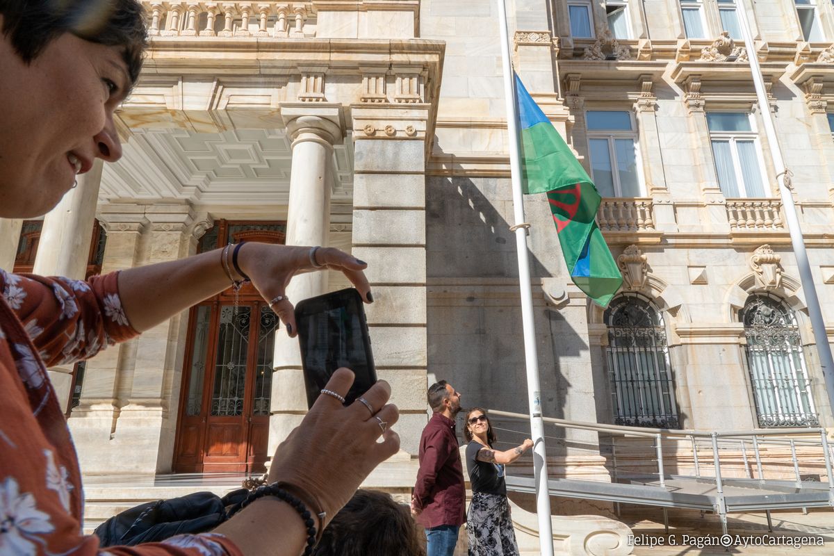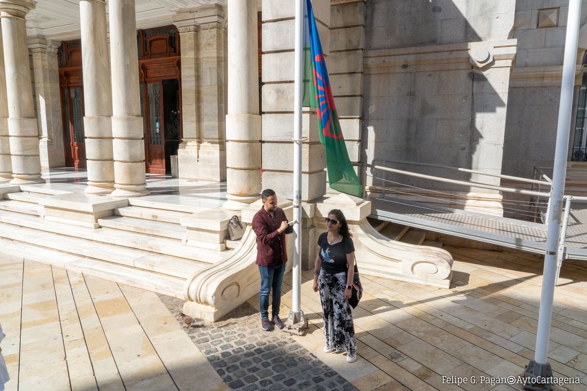 El concejal de Igualdad, David Martínez y Carmen Gheorghe, profesora de la Universidad de Bucarest y presidenta de la Asociación Feminista en Rumanía Opre Romja, junto a representantes del pueblo gitano y técnicos del Área de Igualdad del Ayuntamiento de Cartagena, han asistido al izado de bandera, que ha supuesto el pistoletazo de salida del resto de actividades en conmemoración del Día de la Resistencia Romaní que se celebrarán en el día de hoy.