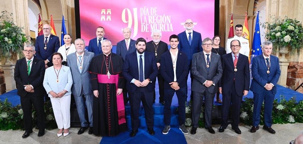 - Los condecorados con las Medallas de Oro de la Región fueron la actriz Margarita Lozano (a título póstumo), los Coros y Danzas de Lorca, el Colegio de Economistas de la Región, la Facultad de Ciencias del Trabajo de la Universidad de Murcia, la letrada de la Asamblea Regional Encarnación Fernández, el tenista Carlos Alcaraz, el Real Casino de Murcia, el médico Vicente Vicente, la Federación Regional de Organizaciones y Empresas de Transporte (Froet), el artista Cristóbal Gabarrón y el presidente de Postres Reina, Alfonso López Rueda.