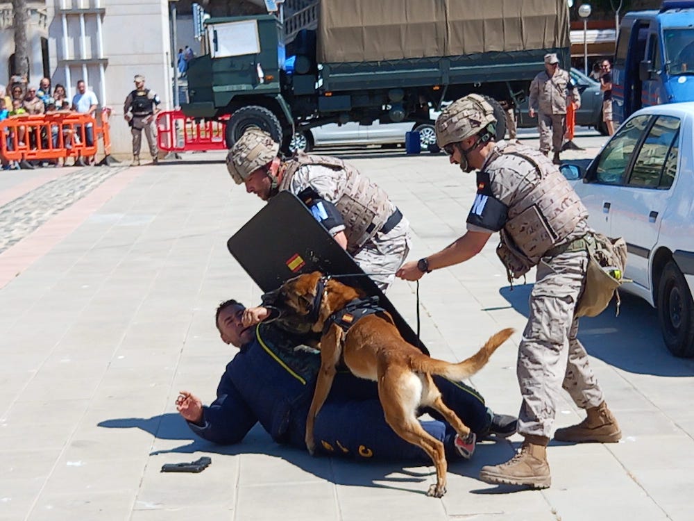 Otro de los actos a destacar del día fue la exhibición de la Unidad Cinológica del Tercio de Levante, un cuerpo compuesto por soldados de Infantería de Marina especializados en el trabajo con perros en determinadas misiones de localización de drogas, explosivos e incluso combate. Así, los llamados guías -el nombre con el que se conoce al adiestrador de un perro en esta unidad- demostraron a los asistentes las capacidades de sus compañeros de cuatro patas.