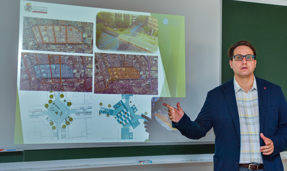 Los cruces de las calles del Ensanche de Cartagena serán espacios urbanos más atractivos para peatones y ciclistas si se lleva a cabo la propuesta de Ordenanza de Zona de Bajas Emisiones (ZBE) que el profesor Salvador García-Ayllón, responsable del grupo de I+D de Política Territorial, Planificación Ambiental y de la Infraestructuras de la UPCT, ha elaborado para el Ayuntamiento de Cartagena.