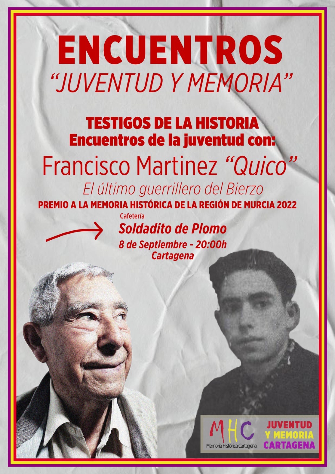El próximo 8 de septiembre , jueves, a las 20 horas, en “El soldadito de Plomo”, conversaremos con Quico, guerrillero antifranquista, ganador del premio a la Memoria Histórica de la Región de Murcia de este año.