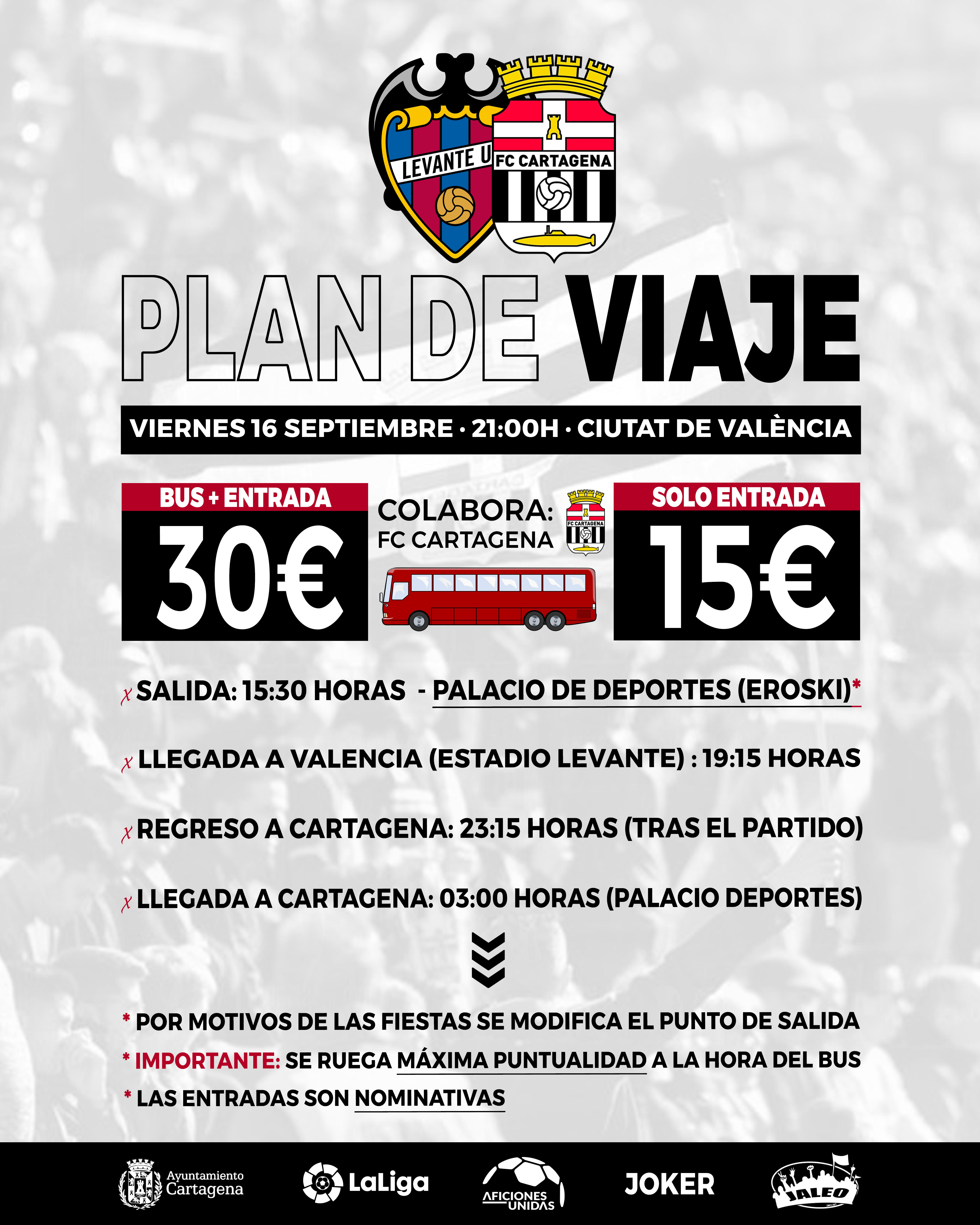 La Federación de Peñas del Fútbol Club Cartagena organiza un desplazamiento a tierras valencianas para apoyar al equipo en su partido frente al Levante UD. El encuentro tendrá lugar el viernes 16 de septiembre a las 21:00 en el Estadio Levante. El FC Cartagena colabora en la organización del viaje que tendrá un coste de 30€ el autobús y la entrada, mientras que solo la entrada tendrá un coste de 15€ y serán nominativas.