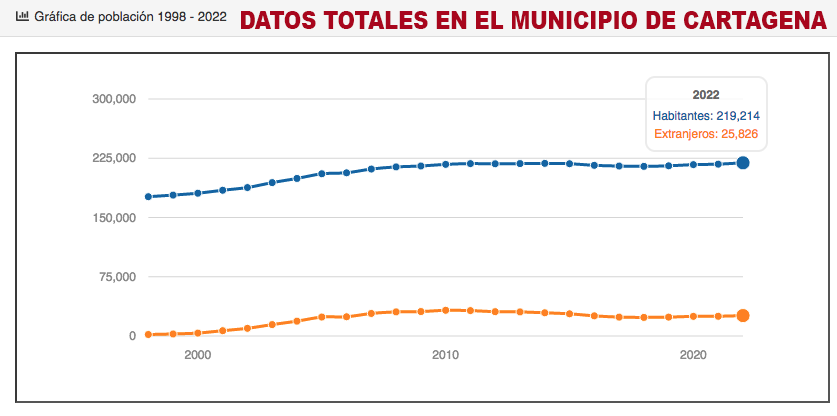 El territorio cartagenero cuenta a uno de enero de 2022 una población de 219.214 habitantes, siendo la mayor cifra del presente siglo, superando los 217.722 de 2018 tras un incremento de 1.700 personas con respecto a un año atrás. El mayor aumento se da en Barrio Peral (+162), Santa Lucía (+105), La Manga (+63), Los Nietos (+57) y otras poblaciones del Mar Menor, además de Los Segados (+46) en La Magdalena. El mayor descenso se da en la zona urbana (-194), de los que 77 corresponden al casco histórico, que sigue el descenso de población iniciado en 2008, pasando desde entonces de 63.588 personas a 42.250. Sube la población extranjera en 862 residentes censados.