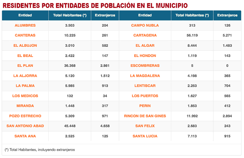 El mayor aumento se da en la entidad de San Antonio Abad (+352), donde Barrio Peral sube en 162 vecinos, mientras que San Antón baja en 25. El otro foco de aumento destacado está en el Rincón de San Ginés (+494), con aumento en casi todas sus poblaciones, destacando La Manga (+63) y todas las poblaciones del Mar Menor, con Los Nietos al frente con +57. Otro punto a resaltar es la diputación de La Magdalena (+193), donde el incremento estuvo en Los Segados (+46) y en casas diseminadas por el campo. Otros aumentos destacados como entidades son El Algar (+151, de los que 42 corresponden a Los Urrutias), Santa Lucía (+105), El Plan (+93), Perín (+89), Lentiscar (+67), La Palma (+64), La Aljorra (+61), Los Puertos (+52), Santa Ana (+43), El Beal (+39), Pozo Estrecho (+38) y Alumbres (+36).