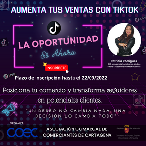 Con el objetivo de promocionar al pequeño comercio tradicional entre los jóvenes de la Comarca del Campo de Cartagena, la Asociación Comarcal de Comerciantes de Cartagena, subvencionado por la Dirección General de Comercio, pone en marcha este proyecto formativo, a través del que se seleccionará y formará a un total de 20 jóvenes entre 18 y 35 años con la metodología de la Academia Oficial de TikTok, con el fin de que sean embajadores de marca del comercio local a través de esta aplicación y su conversión en Instagram.