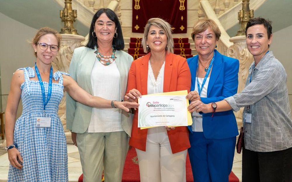 El Ayuntamiento de Cartagena ha logrado por sexto año consecutivo el sello Infoparticipa que concede el Grupo de Investigación ComSET (Comunicación Sonora, Estratégica y Transparencia) de la Universidad Autónoma de Barcelona. El galardón, correspondiente al año 2021 y que reconoce los valores de comunicación pública y transparencia de los portales web municipales, ha sido entregado a Cartagena junto a otros ocho ayuntamientos de la Región (Águilas, San Pedro del Pinatar, Mula, Alcantarilla, Torre Pacheco, Las Torres de Cotillas, Lorquí y Caravaca de la Cruz) en un acto que ha tenido lugar en el Palacio Consistorial, coincidiendo con la celebración de VI Congreso Internacional de Transparencia y Gobierno Abierto.