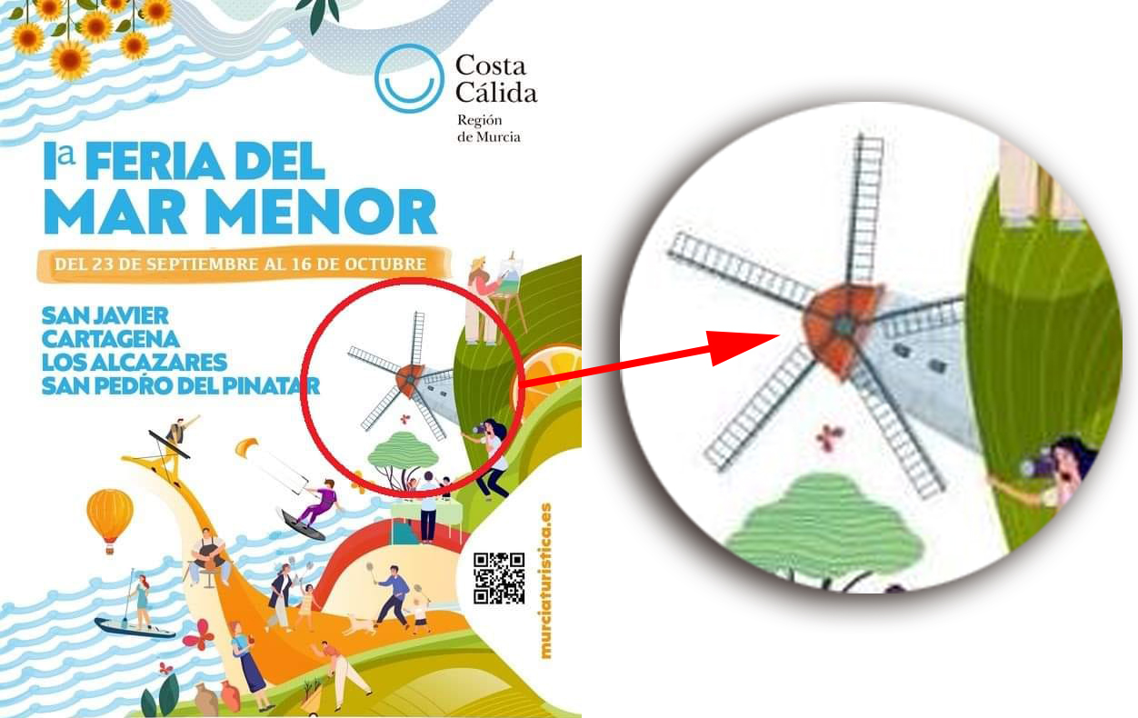 “¿Os imagináis en un cartel sobre una fiesta en Murcia que apareciese la Virgen de Monserrat en lugar de la Virgen de La Fuesanta?, ¿y si le quitaran negritud al asunto diciendo que no seamos tiquismiquis, que al fin y al cabo son la Virgen? Pues eso mismo con este cartel poniendo un molino holandés de aspas en lugar de uno nuestro de vela latina”. Es frase del artista galileo Javier Lorente al detectar la presencia de un molino que no se corresponde al típico de ocho velas del Campo de Cartagena en el cartel de la I Feria del Mar Menor.