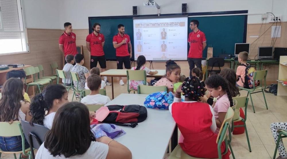 Todos los alumnos de infantil y primaria del colegio, llegando a los 160, junto al profesorado, han compartido y participado en la actividad que ha tenido una primera parte donde los escolares han tenido un encuentro en el aula con los futbolistas del equipo cartagenero.