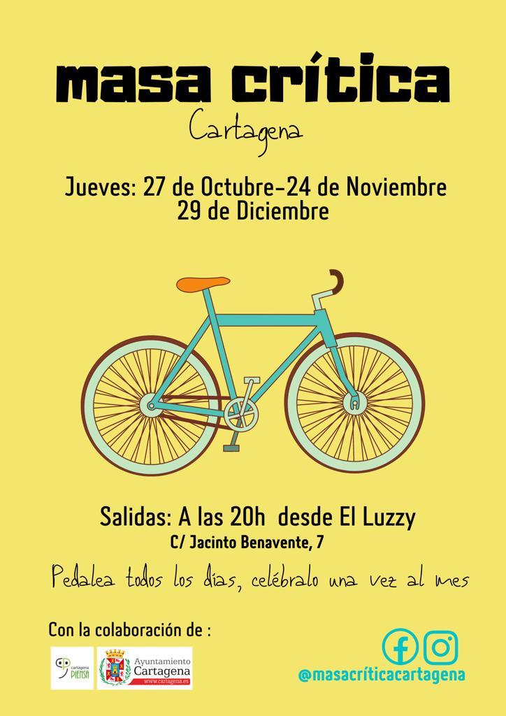 "Desde la organización de Masa Crítica pedimos a todos los cartageneros y cartagenera, que estén preocupados por la salud y el bienestar en las ciudades, que se sumen a la misma. El último jueves de cada mes, a las 20.00 horas, saldremos desde la plaza anexa al Centro Cultural Ramón Alonso Luzzy, para realizar un recorrido urbano, en un ambiente festivo, pidiendo espacio seguro, para poder desplazarnos en bicicleta" dice Fernando Tonda Mena de MoviliCT por tu Salud.