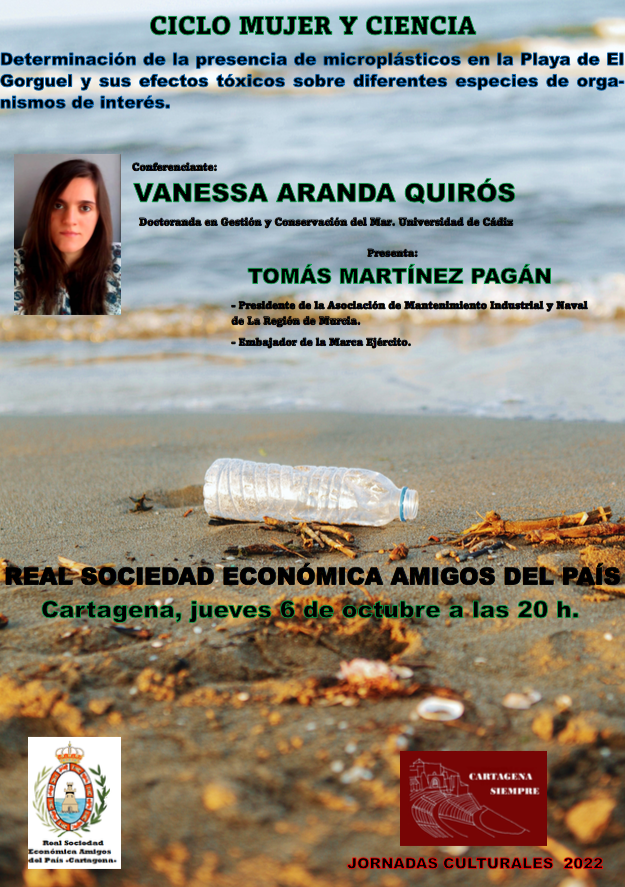 También estaba Vanessa Aranda Quirós, una joven gaditana doctorada en Gestión y Conservación del Mar por la Universidad de Cádiz, quien el pasado año diseñó el ciclo 'Mujer y ciencia' sobre el medioambiente con un formato que después "han copiado cinco universidades", ha resaltado Cortado, que fue quien la eligió después de indagar por ocho universidades hasta encontrar a una persona "con unas características concretas y que sea futuro" para preparar y dirigir ese ciclo, que en esta segunda edición tendrá "cuatro proyectos que están vivos", ha resaltado el vicepresidente. El primer capítulo tendrá lugar hoy en la Real Sociedad Económica de Amigos del País, en la calle del Aire de Cartagena con el título 'Determinación de la presencia de microplásticos en la playa de El Gorguel y sus efectos tóxicos sobre diferentes especies de organismos de interés'. También desvelará las plantaciones que han pegado y las que no en ese lugar. En el acto de esta noche, que presentará Tomás Martínez Pagán, Vanessa Aranda recibirá la primera de las dos insignias de plata que entregará en esta edición 'Cartagena Siempre', siendo aún la segunda un misterio.