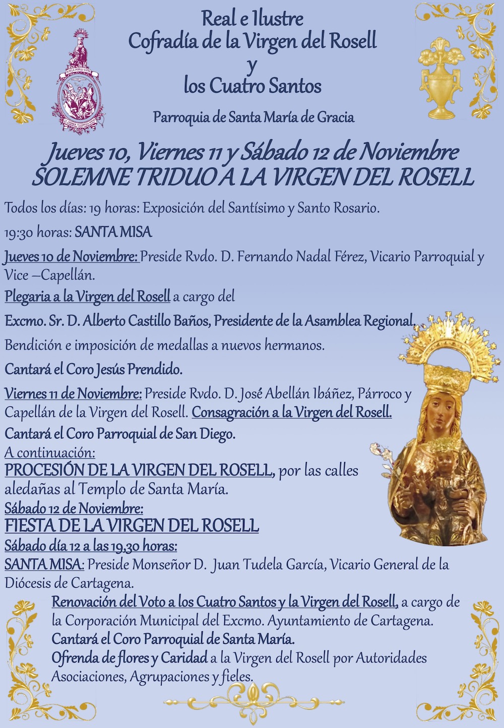 Como es tradicional, la segunda semana de noviembre acoge los actos en honor a la imagen que mantiene su patronazgo sobre la ciudad. El triduo tendrá lugar del 10 al 11 de dicho mes, con desfile de la imagen por las calles del casco histórico el viernes y renovación del voto a los cuatro santos y a la Virgen el sábado, día en el que también se llevará a cabo la ofrenda floral.