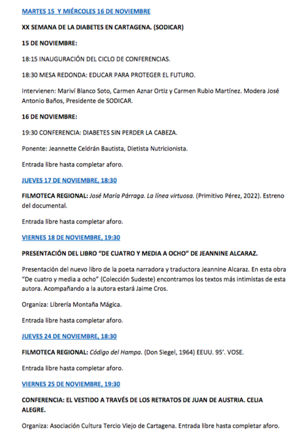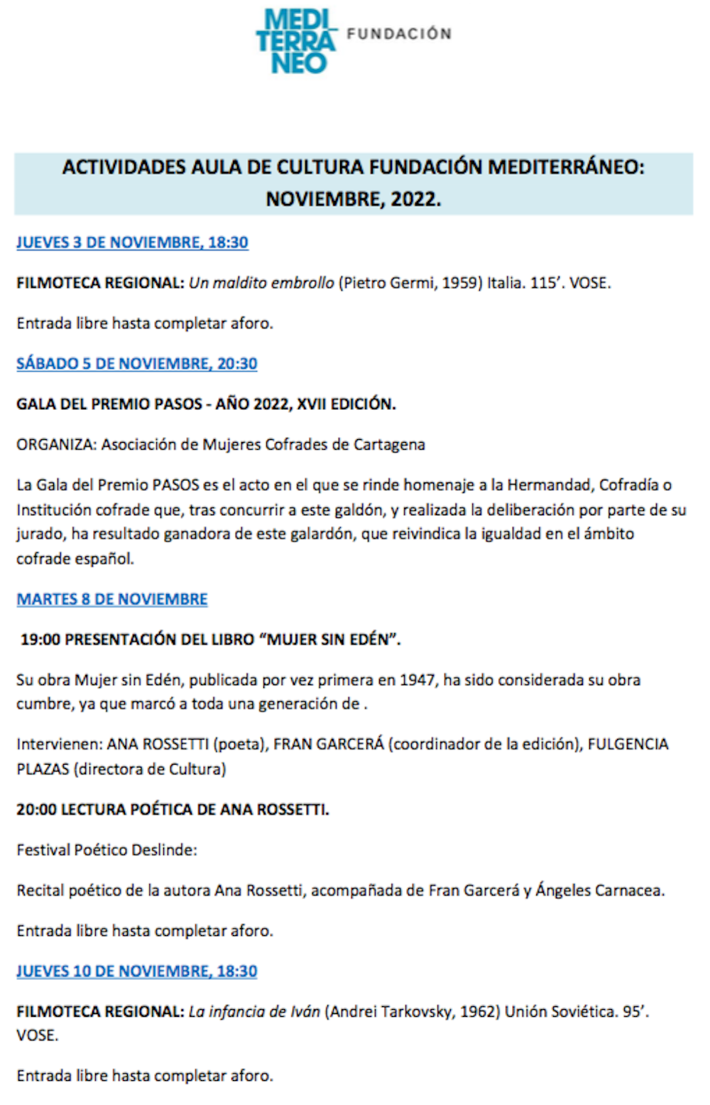 El aula 'Antonio Ramos Carratalá' de la calle Mayor de la ciudad de Cartagena acoge el próximo mes proyección de películas de cine, presentaciones de libros, lecturas poéticas, conferencias, la XX Semana de la diabetes y la gala del 'Premio Pasos'.