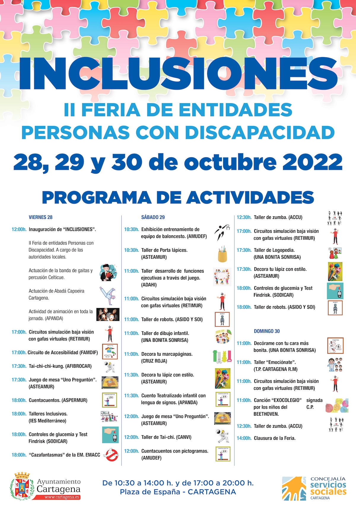La feria ha sido organizada por la concejalía de Servicios Sociales del Ayuntamiento de Cartagena, con la colaboración de otras áreas de gobierno como Deportes o Infraestructuras, entre otras. El horario de apertura es de 10:30 a 14:00 horas y de 17:00 a 20:00 horas.